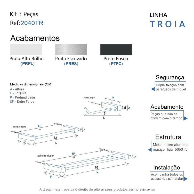Kit Acessórios Para Banheiro Preto Fosco 3 Peças Grego Metal 2040trO kit de acessórios para banheiro da linha Troia possui um design atemporal, são peças que se destacam com imponência e modernidade. ;Além de decorar, organiza com funcionalidade o banheiro. Criado em metal nobre com uma qualidade que abrange áreas litorâneas e possui a garantia de um acabamento muito resistente. ;Agora é só você adquirir estes lindos acessórios e fazer o seu projeto se tornar realidade com um banheiro prático para toda a sua família.CARACTERÍSTICAS ;• Fabricado em metal alumínio.• Disponível no Prata Alto Brilho, Escovado e Preto Fosco.• Pode ser instalado em parede, azulejo e porcelanato.BENEFÍCIOS• Fixação prática e segura com parafusos e buchas inclusos.• O produto não possui nenhum detalhe em plástico (ABS).• Fácil higienização, ideal para locais que exigem limpeza constante.• Aproveitamento inteligente do espaço, ideal para ambientes compactos.• Resistente à corrosão e luz solar.ITENS ENVIADOS: 1 porta papel higiênico, 1 toalheiro rosto 30cm, 1 toalheiro duplo 60cm, kit de parafusos e manual instrução instalação.INSTALAÇÃO INTELIGENTEAo 1º furo, use uma broca medida menor, após use a medida correta e finalize, vai ajudar na precisão da fixação da bucha principalmente em azulejos e porcelanato.