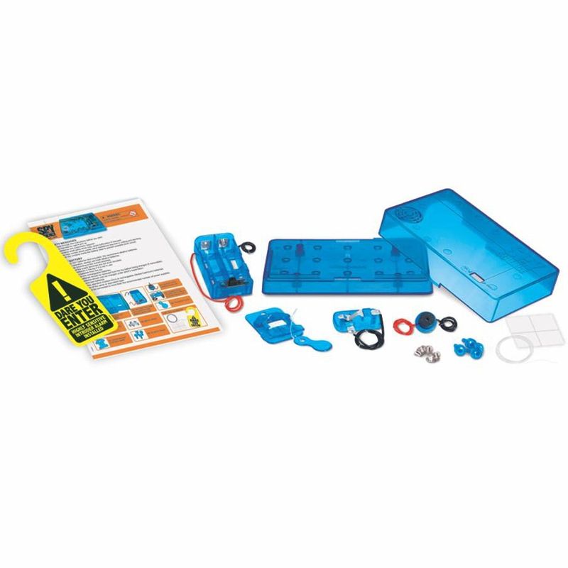 Kit Alarme de Invasão - 3D Comex Aprenda a ciência de montar um circuito elétrico. Construa seu próprio alarme e coloque-o atrás de sua porta. Surpreenda os intrusos que tentarem entrar em seu quarto. É legal e divertido!Contém plataforma de plástico e caixa do alarme, um conjunto de acessórios de plástico, cavilhas metálicas, campainha elétrica, fio, corda para disparo do alarme, instruções detalhadas e curiosidades. Medidas do kit alarme de invasão: 22 cm x 17 cm x 6 cm Idade: a partir de 5 anos. Embalagem: caixa.