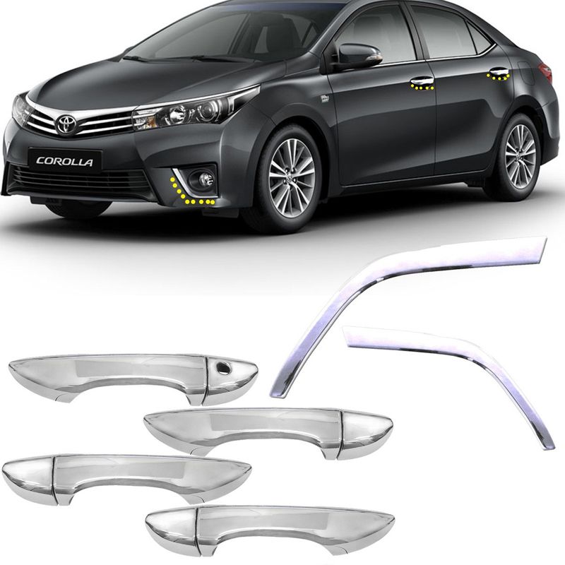 * KIT APLIQUE CROMADO MAÇANETA E MOLDURA DO MILHA * TOYOTA COROLLA (2015 À 2017) *** ATENÇÃO: *** OS NOSSOS PRODUTOS SÃO APLIQUES COLADOS POR CIMA DAS PEÇAS ORIGINAIS DO VEÍCULO E NÃO SUBSTITUEM AS ORIGINAIS.* A EMBALAGEM CONTÉM: - Jogo com 4 Apliques das Capas Cromadas das Maçanetas - 01 Par de Apliques dos Faróis de Milha - CROMO DE ALTA QUALIDADE- FÁCIL INSTALAÇÃO- CONTÉM FITA DUPLA FACE GARANTIA: 03 MESES IMAGEM MERAMENTE ILUSTRATIVA NÃO NOS RESPONSABILIZAMOS PELO MAU USO DO PRODUTO CLIQUE EM COMPRAR SOMENTE SE TIVER CERTEZA TODOS OS PRODUTOS COMERCIALIZADOS PELA GOLDEN PARTES ACOMPANHAM NOTA FISCAL E GARANTIA.