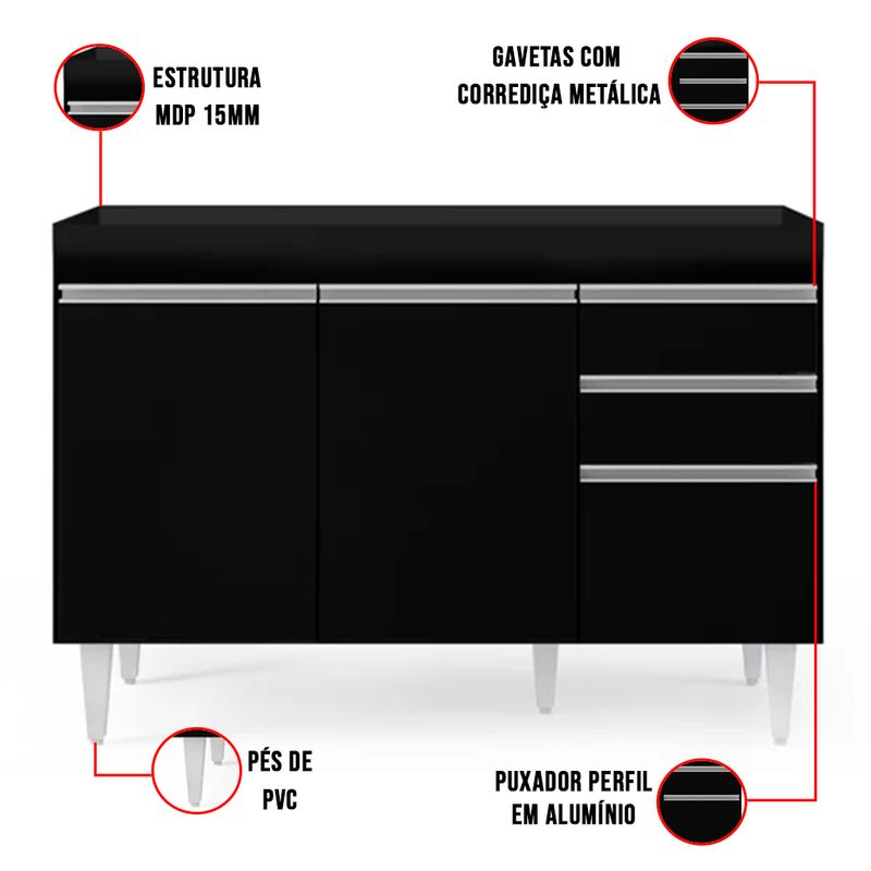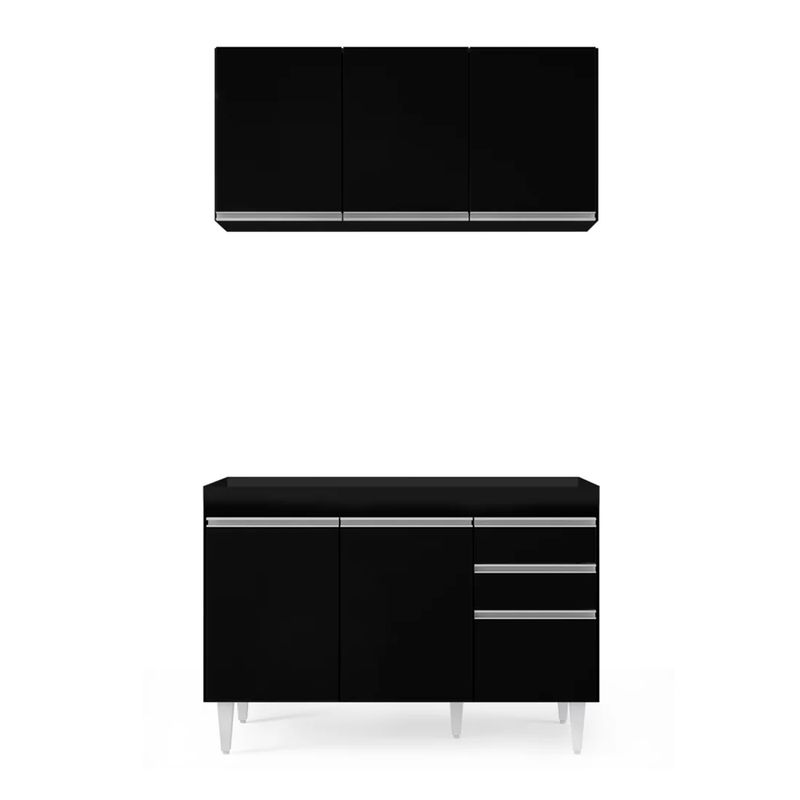 Você é daquelas pessoas que amam cozinhar rodeadas pela família ou amigos? Que tal aprimorar seus dotes culinários de uma forma divertida e memorável? Antes de qualquer coisa, seu espaço precisa estar aconchegante, completo e com um acabamento impecável. Isso mesmo, a ideia é impressionar seus convidados especiais, antes mesmo do prato principal! Basta caprichar na decoração optando por móveis sofisticados e modernos. Olha só este Balcão e Armário Aéreo Dora 120 cm no tom Preto. O Balcão não acompanha Tampo, possui 2 gavetas com corrediças metálicas e amplo espaço interno para guardar os talheres, contém 3 portas e 1 prateleira para acomodar seus objetos, os puxadores são em alumínio e os pés em PVC reguláveis. Já o armário aéreo possui 3 portas, 1 prateleira e puxadores em alumínio iguais aos do Balcão. Ambos são produzidos em MDP 15mm, revestidos em BP, acabamento em Fita de Borda em Papel, calço e dobradiças metálicas. E por falar no tom Preto deste móvel, uma opção luxuosa e charmosíssima que fará toda diferença no seu ambiente!. Gostou desse lindo Balcão e Armário Aéreo Dora? Escolha o seu, que nós enviamos para você! Dimensões Armário Aéreo Altura total: 54 cm Largura total: 120 cm Profundidade total: 28,5 cm Peso: 24,4 kg Dimensões Balcão Altura total: 83 cm Largura total: 117 cm Profundidade total: 50 cm Peso: 38 kg Especificações do Produto Material Estrutura: MDP 15 mm. Acabamento: Pintura BP. Escala de Brilho: Fosco. Peso suportado: Até 30 kg. Possui Prateleiras: Sim, 2 Prateleiras. Possui Portas: Sim, 6 Portas. Tipo de Porta: Convencional. Possui Gavetas: Sim, 2 Gavetas Possui Nichos: Não. Possui Puxador: Sim, Alumínio. Possui Tampo: Não. Possui Pés: Sim, PVC com Regulagem Cor: Preto Garantia: 90 dias contra defeito de fabricação. Necessita Montagem: Sim. Complexidade da Montagem: Média: Deve ser montado por um montador especializado. Instruções de limpeza: Para maior durabilidade do produto, recomendamos mantê-lo longe de umidade e poeira e da exposição direta a luz solar. A limpeza deve ser feita usando um pano macio e semi úmido, sem o uso de produtos químicos como álcool ou Lustra Móveis. Ao precisar movimentar o móvel, evite arrasta-lo ou levanta-lo sozinho, peça ajuda a outra pessoa para realizar a tarefa. Você irá receber: 02 Volumes com 01 Armário Aéreo e 01 Balcão Observações Relevantes - Todos os produtos vão embalados com total segurança; - As cores dos produtos podem sofrer alterações dependendo do seu monitor; - Para futuras compras, não garantimos a mesma tonalidade de cor, pois existe variação a cada lote do fabricante do tecido; - As imagens são meramente ilustrativas, não acompanham objetos de decoração e eletros; - Confira as dimensões do produto no momento da compra e certifique-se de que passará normalmente por escadas, elevadores, portas e corredores; - Importante: Por se tratar de estofado as medidas podem ter uma pequena variação em até 3 cm; - Não nos responsabilizamos no ato da entrega por montagens, desmontagens, instalações de produtos; - Não nos responsabilizamos no ato da entrega por subir escadas, elevadores, nem utilização de guinchos ou equipamentos similares para acesso a pisos superiores em apartamentos; - A entrega do produto é realizada em todo território nacional, até onde as rodovias alcançam, entregas fluviais ou aéreas devem ser cotadas a parte; - Observando as orientações acima, evita-se futuros desagrados ou imprevistos com a entrega do produto. Havendo despesas adicionais, serão de responsabilidade do cliente;