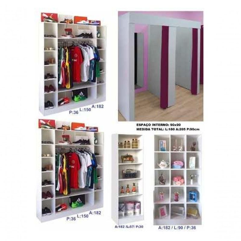 Kit Armário Colméias Cabideiro Provador e Estante PrateleiraO kit da primeira foto? Sim, são todos os itens!Especificações Técnicas:- Marca: Magia Móveis - Garantia: 03 meses2 Unidades Colméia Ana: É aquela colmeia perfeitinha, que dispõe de muito espaço tanto em prateleiras quanto em cabideiros.- Altura: 1,82m - Largura: 1,50m - Profundidade: 36cm // MDP 12mm1 Unidade Colméia 15 Nichos Bia: é excelente para armazenar e expor, ajuda na decoração e deixa tudo organizado e bem visível. Todo mundo ama ela!- Altura: 182 cm- Largura: 90 cm- Profundidade: 34cm // MDP 12mm- Cada nicho tem: Altura: 33cm / Largura: 28cm1 Unidade Estante Liz: Ela é cheia de prateleiras! Deixa tudo organizado, comporta todos os tipos de objetos e ainda ajuda a decorar a sua loja.- Altura: 182 cm- Largura: 57 cm- Profundidade: 30 cm.1 Unidade Provador Duplo: Acompanha 8 ganchos metálicos para pendurar roupas e cabides e 2 Varões de Metal para pendurar as cortinas- Largura 1,80m - Altura: 2,05m - Profundidade: 90cm.- Espaço interno de cada vão: 90x90cm. ATENÇÃO: As peças não vão furadas, vão cortadas e com acabamento de bordas. Acompanha Manual de Montagem, parafusos e cantoneiras para que você mesmo possa montar e fixar na parede. É super fácil de montar/instalar, basta alinhar as peças e parafusar.