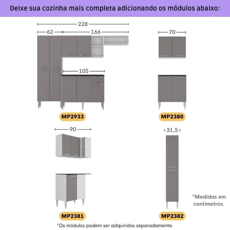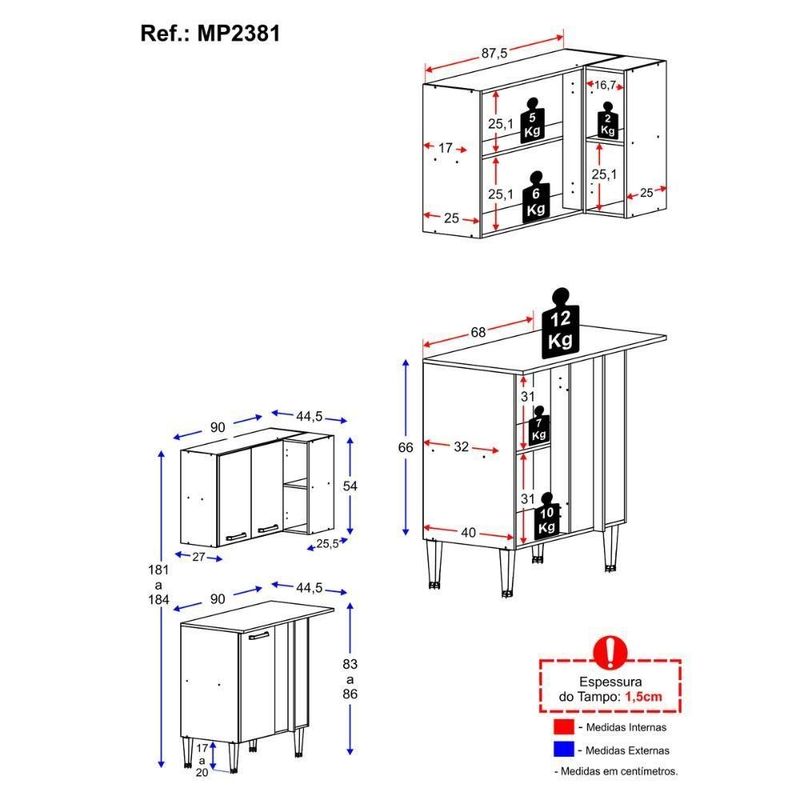 Kit Armário De Cozinha Aéreo Canto Com Balcão Pequim Multimóveis Mp2381 Branco/lacca FumêAproveite cada canto da sua cozinha com inteligência e estilo com o Kit Armário de Cozinha Aéreo Canto com Balcão 90cm 3 Portas Pequim Multimóveis MP2381. Desenvolvido para otimizar espaços e transformar áreas pouco utilizadas em soluções funcionais, ele combina design moderno, organização eficiente e a qualidade que faz toda a diferença no seu dia a dia.Diferenciais:- 3 anos de garantia contra defeitos de fabricação e material.- Produzido em madeira de reflorestamento (MDP 12mm - portas e tampo de 15mm): garante resistência e maior durabilidade.- Acabamento acetinado com cerca de 20% de brilho: proporciona elegância e facilidade na limpeza.- Versões Branco/Lacca Fumê e Preto/Lacca Fumê com portas em acabamento brilhante, agregando ainda mais sofisticação ao ambiente.- Módulos para canto (a montagem pode ser feita somente conforme as imagens - não são reversíveis).- 3 portas com amplo espaço interno para melhor organização de utensílios, mantimentos e louças.- Prateleiras internas que facilitam a distribuição e o aproveitamento do espaço.- Nichos externos para acomodar temperos ou pequenos itens decorativos.- Balcão com tampo que suporta até 12kg.- Puxadores em ABS com acabamento cromado: modernos e resistentes.- Pés em polipropileno com regulagem de altura, garantindo melhor nivelamento no piso.Conteúdo da Embalagem:1 (um) Armário Aéreo de Canto 90cm1 (um) Balcão de Cozinha de Canto com Tampo 90cmManual de MontagemKit FerragemDimensões do Produto Montado:Armário Aéreo - Altura: 54cm | Largura: 90cm | Profundidade: 44,5cmBalcão - Altura: 83 a 86cm | Largura: 90cm | Profundidade: 44,5cm*Você pode consultar as medidas detalhadas na imagem técnica do produto.*As cores do produto podem sofrer variações de tonalidade de acordo com as configurações do seu dispositivo.*Aqui na Loja Multimóveis, você pode concluir sua compra facilmente com toda segurança. A entrega é garantida e você está em 1° lugar.Imagem meramente ilustrativa. Decoração não acompanha o produto.O produto será entregue desmontado e não disponibilizamos o serviço de montagem. Acabamento: Pintura UV | Tonalidade: Preto | Material: MDP | Referência do Modelo: MP2381 | Coleção: Pequim | Instruções de Cuidado: Para uma limpeza mais efetiva, utilizar apenas pano macio umedecido e sabão neutro. Não utilizar produtos abrasivos. | Sistema de Montagem: O produto acompanha manual de montagem e kit ferragem. O produto será entregue desmontado e não disponibilizamos o serviço de montagem. | Produto Composto por: 1 armário aéreo de canto 90cm, 1 balcão de canto com tampo 90cm, manual de montagem e kit ferragem. | Altura Montado: 184 | Largura Montado: 90 | Profundidade Montado: 44.5 | Tamanho (L x A x P): 90 x 184 x 44,5 | Garantia do Fabricante: 3 | Fabricante: Multimóveis | Requer Montagem: Sim | Quantidade de Portas: 3 | Quantidade de Gavetas: 0 | Quantidade de Prateleiras: 3 | Quantidade de Puxadores: 3 | Quantidade de Pés: 4 | Porta com Vidro: Não | Corrediça: N/A | Material do Puxador: ABS | Material dos Pés: Polipropileno | Acompanha Pia Inox: Não | Balcão 120 cm compatível para uso de pia: Não | Tampo Incluso: Sim | Quantidade de Tampos: 1 | Material do Tampo: MDP | Espessura do Tampo: 1.5 | Com Prateleiras: Sim | Tipo: Modular | RBN: 17100674011 | Altura (cm): 184 cm | Largura (cm): 90 cm | Profundidade (cm): 44,5 cm | Acessórios incluídos: N/A | Ubicação do móvel: Não aplica | Altura do Produto com Embalagem: 11 cm | Largura do Produto com Embalagem: 72 cm | Comprimento do Produto com Embalagem: 95 cm | Peso do Produto com Embalagem: 35000 g | Tempo de Garantia: 3 meses | Destaque 1: Produzido em MDP: maior durabilidade e resistência. | Destaque 2: 3 portas e 2 nichos externos: amplo espaço interno para organização de utensílios. | Destaque 3: Pés em polipropileno com regulagem de altura: perfeito nivelamento do móvel. | Destaque 4: Tamanho do Produto Montado (L x A x P): 90 x 184 x 44,5 cm | Destaque 5: Módulos individuais: permitem a montagem do jeito que você preferir. | Tipo de móveis de cozinha: Armário | Marca: Multimóveis | Materiais do corpo: MDP | Materiais das portas: MDP | Altura do armário: 54 cm | Largura do armário: 90 cm | Profundidade do armário: 44,5 cm | Altura do balcão: 86 cm | Largura do balcão: 90 cm | Profundidade do balcão: 44,5 cm | Modelo detalhado: N/A | Peso (kg): 35 kg | Estilo: Moderno | Capacidade máxima de peso: N/A | Com Pés ajustáveis: Sim | Quantidade de caixas de embalagem: 01 | Peso do Produto: 35 | É personalizado: Não | Baterias são necessárias?: Não | Certificação de teste externa: Não aplicável | Is Fragile: Não | Dimensões do item P x L x A: depth#value=44.5;depth#unit=centimeters;width#value=90;width#unit=centimeters;height#value=184;height#unit=centimeters | Peso do item: unit=kilograms;value=35 | Quantidade de itens: 1 | Número da peça: MP2381.839 | Duração da Garantia: 3 Meses | Montagem: Necessita Montagem | Tipo de Garantia: Garantia do Fabricante | Inclui manual de montagem: Sim | Palavras-chave: armario de cozinha compacta, cozinha compacta, bancada para cooktop, armario cozinha, armario de cozinha, balcao cozinha, armario de cozinha simples, movel para embutir fogao, armario planejado cozinha, balcao cooktop 4 bocas | Componentes incluídos: Kit de instalação | Peso do balcão (kg): N/A | Peso do armário (kg): N/A | Tipo da embalagem do vendor: Sem embalagem adicional | Produto: Armário | Cor: Branco/Lacca Fumê
