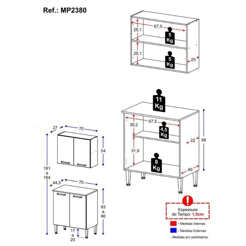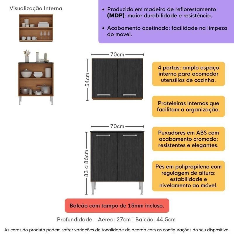 Kit Armário De Cozinha Aéreo Com Balcão 70cm 4 Portas Pequim Multimóveis Mp2380 Madeirado/pretoTransforme sua cozinha em um ambiente mais funcional, elegante e organizado com o Kit Armário de Cozinha Aéreo com Balcão 70cm 4 Portas Pequim Multimóveis MP2380. Ideal para quem busca praticidade no dia a dia sem abrir mão de um design moderno, ele é a solução perfeita para otimizar espaços com charme e eficiência.Diferenciais:- 3 anos de garantia contra defeitos de fabricação e material.- Produzido em madeira de reflorestamento (MDP 12mm - portas e tampo de 15mm): garante resistência e maior durabilidade.- Acabamento acetinado com cerca de 20% de brilho: proporciona elegância e facilidade na limpeza.- Versões Branco/Lacca Fumê e Preto/Lacca Fumê com portas em acabamento brilhante, agregando ainda mais sofisticação ao ambiente.- 4 portas com amplo espaço interno para melhor organização de utensílios, mantimentos e louças.- Prateleiras internas que facilitam a distribuição e o aproveitamento do espaço.- Balcão com tampo que suporta até 11kg (não é compatível com Cooktop devido à profundidade).- Puxadores em ABS com acabamento cromado: modernos e resistentes.- Pés em polipropileno com regulagem de altura, garantindo melhor nivelamento no piso.Conteúdo da Embalagem:1 (um) Armário Aéreo 70cm1 (um) Balcão de Cozinha com Tampo 70cmManual de MontagemKit FerragemDimensões do Produto Montado:Armário Aéreo - Altura: 54cm | Largura: 70cm | Profundidade: 27cmBalcão - Altura: 83 a 86cm | Largura: 70cm | Profundidade: 44,5cm*Você pode consultar as medidas detalhadas na imagem técnica do produto.*As cores do produto podem sofrer variações de tonalidade de acordo com as configurações do seu dispositivo.*Aqui na Loja Multimóveis, você pode concluir sua compra facilmente com toda segurança. A entrega é garantida e você está em 1° lugar.Imagem meramente ilustrativa. Decoração não acompanha o produto.O produto será entregue desmontado e não disponibilizamos o serviço de montagem. Acabamento: Pintura UV | Tonalidade: Preto | Material: MDP | Referência do Modelo: MP2380 | Coleção: Pequim | Instruções de Cuidado: Para uma limpeza mais efetiva, utilizar apenas pano macio umedecido e sabão neutro. Não utilizar produtos abrasivos. | Sistema de Montagem: O produto acompanha manual de montagem e kit ferragem. O produto será entregue desmontado e não disponibilizamos o serviço de montagem. | Produto Composto por: 1 armário aéreo 70cm, 1 balcão com tampo 70cm, manual de montagem e kit ferragem. | Altura Montado: 184 | Largura Montado: 70 | Profundidade Montado: 44.5 | Tamanho (L x A x P): 70 x 184 x 44,5 | Garantia do Fabricante: 3 | Fabricante: Multimóveis | Requer Montagem: Sim | Quantidade de Portas: 4 | Quantidade de Gavetas: 0 | Quantidade de Prateleiras: 2 | Quantidade de Puxadores: 4 | Quantidade de Pés: 4 | Porta com Vidro: Não | Corrediça: N/A | Material do Puxador: ABS | Material dos Pés: Polipropileno | Acompanha Pia Inox: Não | Balcão 120 cm compatível para uso de pia: Não | Tampo Incluso: Sim | Quantidade de Tampos: 1 | Material do Tampo: MDP | Espessura do Tampo: 1.5 | Com Prateleiras: Sim | Tipo: Modular | RBN: 17100674011 | Altura (cm): 184 cm | Largura (cm): 70 cm | Profundidade (cm): 44,5 cm | Acessórios incluídos: N/A | Ubicação do móvel: Não aplica | Altura do Produto com Embalagem: 12 cm | Largura do Produto com Embalagem: 72 cm | Comprimento do Produto com Embalagem: 80 cm | Peso do Produto com Embalagem: 28000 g | Tempo de Garantia: 3 meses | Destaque 1: Produzido em MDP: maior durabilidade e resistência. | Destaque 2: 4 portas com dobradiças metálicas: amplo espaço interno para organização de utensílios. | Destaque 3: Pés em polipropileno com regulagem de altura: perfeito nivelamento do móvel. | Destaque 4: Tamanho do Produto Montado (L x A x P): 70 x 184 x 44,5 cm | Destaque 5: Módulos individuais: permitem a montagem do jeito que você preferir. | Tipo de móveis de cozinha: Armário | Marca: Multimóveis | Materiais do corpo: MDP | Materiais das portas: MDP | Altura do armário: 54 cm | Largura do armário: 70 cm | Profundidade do armário: 27 cm | Altura do balcão: 86 cm | Largura do balcão: 70 cm | Profundidade do balcão: 44,5 cm | Modelo detalhado: N/A | Peso (kg): 28 kg | Estilo: Moderno | Capacidade máxima de peso: N/A | Com Pés ajustáveis: Sim | Quantidade de caixas de embalagem: 01 | Peso do Produto: 28 | É personalizado: Não | Baterias são necessárias?: Não | Certificação de teste externa: Não aplicável | Is Fragile: Não | Dimensões do item P x L x A: depth#value=44.5;depth#unit=centimeters;width#value=70;width#unit=centimeters;height#value=184;height#unit=centimeters | Peso do item: unit=kilograms;value=28 | Quantidade de itens: 1 | Número da peça: MP2380.839 | Duração da Garantia: 3 Meses | Montagem: Necessita Montagem | Tipo de Garantia: Garantia do Fabricante | Inclui manual de montagem: Sim | Palavras-chave: armario de cozinha compacta, cozinha compacta, bancada para cooktop, armario cozinha, armario de cozinha, balcao cozinha, armario de cozinha simples, movel para embutir fogao, armario planejado cozinha, balcao cooktop 4 bocas | Componentes incluídos: Kit de instalação | Peso do balcão (kg): N/A | Peso do armário (kg): N/A | Tipo da embalagem do vendor: Sem embalagem adicional | Produto: Armário | Cor: Madeirado/Preto