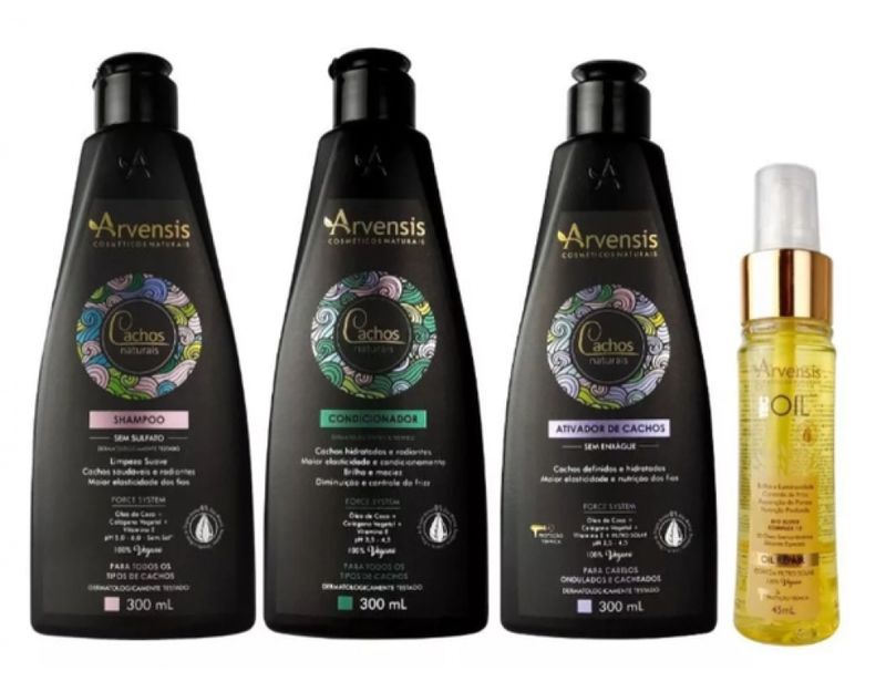 Kit Arvensis Cachos Naturais + Óleo Reparador Tec OilA Chique Cosméticos é uma loja virtual de cosméticos, que cuida com todo carinho da beleza das pessoas modernas e atualizadas.Trabalhamos com produtos inovadores, realçando a beleza e promovendo o bem estar de nossos clientes.Neste anúncio contém:1 unidade Shampoo Cachos Naturais Arvensis 300ml1 unidade Condicionador Cachos Naturais Arvensis 300ml1 unidade Ativador Ondulados Cachos Naturais Arvensis 300ml1 unidade Óleo Reparador Tec Oil Arvensis 45mlSHAMPOO CACHOS NATURAIS ARVENSIS 300MLO Shampoo Cachos Naturais foi desenvolvido com uma formulação livre de sulfato e sal, especial para a limpeza suave de todos os tipos de cabelos cacheados. Elaborado através da perfeita combinação de Óleo de Coco, Colágeno Vegetal e Vitamina E, o Shampoo Cachos Naturais proporciona inúmeros benefícios como reparação dos fios danificados, aumento da elasticidade, maciez e brilho extra. Sua ação protetora ainda confere resistência, formação de filme e controle de frizz, além de manter a umidade natural para cachos nutridos e radiantes.PRINCIPAIS ATIVOS:- Óleo de coco: Alto poder umectante e hidratante, repõe nutrientes e age na diminuição do frizz. Ainda tem ação de selamento de cutículas evitando pontas duplas.- Colágeno Vegetal: Fornece aminoácidos e proteínas para nutrição funcional da fibra, promove hidratação e restaura a elasticidade dos fios. Forma um filme flexível ultra-substantivo que protege e define os cachos, além de atuar no controle do frizz.- pH 5-6CONDICIONADOR CACHOS NATURAIS ARVENSIS 300MLO Condicionador Cachos Naturais foi desenvolvido com uma formulação especial, ideal para a hidratação de todos os tipos de cabelos cacheados. Elaborado através da perfeita combinação de Óleo de Coco, Colágeno Vegetal e Vitamina E, o Condicionador Cachos Naturais proporciona inúmeros benefícios como nutrição avançada, reparação dos fios danificados, condicionamento equilibrado, aumento da elasticidade, maciez e brilho extra. Sua ação protetora ainda confere resistência e controle de frizz, além de manter a umidade natural para cachos nutridos e radiantes.PRINCIPAIS ATIVOS:- Óleo de coco: Alto poder umectante e hidratante, repõe nutrientes e age na diminuição do frizz. Ainda tem ação de selamento de cutículas evitando pontas duplas.- Colágeno Vegetal: Fornece aminoácidos e proteínas para nutrição funcional da fibra, promove hidratação e restaura a elasticidade dos fios. Forma um filme flexível ultra-substantivo que protege e define os cachos, além de atuar no controle do frizz.- PH: 4-4,5Indicação: Todos os cachos.CREME ATIVADOR CACHOS ONDULADOS E CACHEADOS ARVENSIS 300MLDesenvolvida para hidratar, nutrir, ativar e definir os cachos. Toda a linha Cachos Naturais confere tratamento eficiente que resulta cabelos macios, maleáveis e iluminados.Seus principais ativos fornecem aminoácidos e proteínas para nutrição funcional da fibra, hidratação funcional; restaura elasticidade dos fios, conferem alto poder umectante, nutrição profunda e consequentemente mais vitalidade aos cabelos.Indicação: Cabelos ondulados e cacheados (2A / 2B / 2C / 3A).Principais ativos: Óleo de Coco; Colágeno Vegetal.A ação protetora do Ativador de Cachos Ondulados e Cacheados confere resistência, formação de filme, controle de frizz, mantendo a umidade natural e definindo cachos radiantes. Contém filtro solar. (300mL) - pH 4,0 - 4,5OIL REPAIR TEC OIL ARVENSISCom uma associação de 12 óleos preciosos e lendários, obtidos a partir de nozes, sementes, ervas e frutos, a linha Tec Oil foi desenvolvida para tratar os fios agredidos por agentes externos, desde a exposição ao sol e poluição até intervenções químicas que danificam a estrutura capilar.Proporciona nutrição profunda e avançada, além de proteção contra o ressecamento e ação disciplinante. Enriquecida com vitaminas A, E, B3, B5 E B6, a linha ainda confere proteção contra danos e selagem imediata das cutículas auxiliando no tratamento de fios extremamente danificados e pontas bipartidas.Indicação: Cabelos danificados, com excesso de ressecamento.Principais ativos: Bio Elixir (uma combinação de 12 óleos nobres), Vitaminas A, E e do complexo B.Com toque seco, o Óleo Nobre Tec Oil confere brilho extra e luminoso aos fios, além de reparar as pontas duplas e diminuir o frizz. Contém filtro solar e protetor térmico. (45 mL)