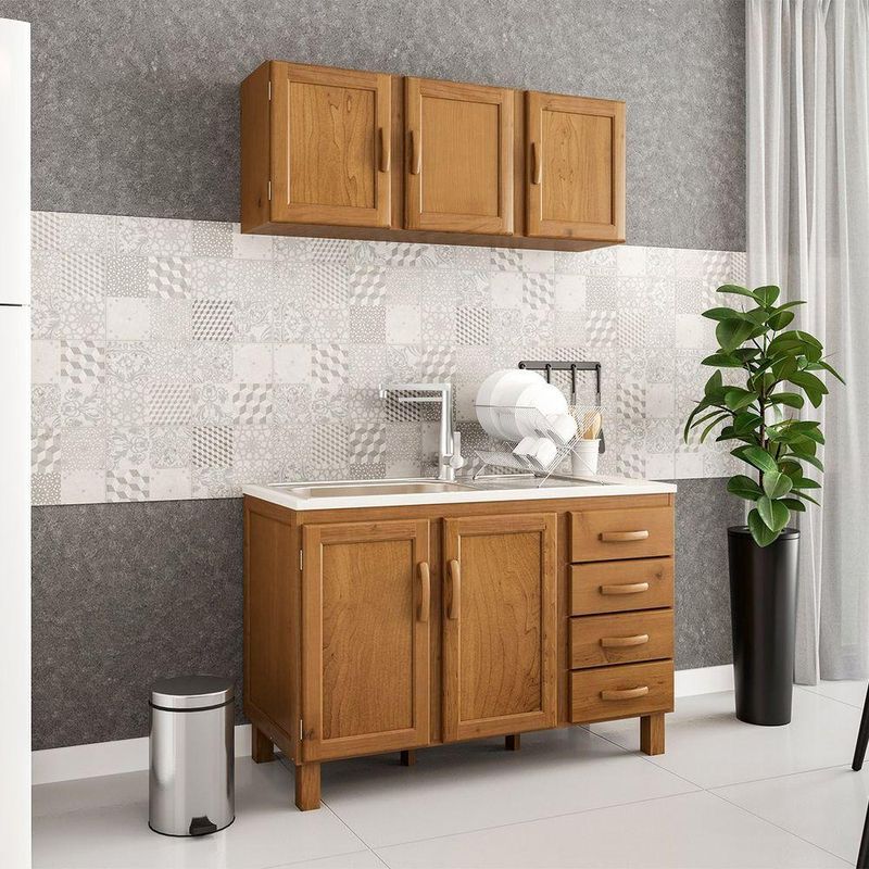 Kit Balcão E Armário Aéreo 120 Cm 100% Madeira Maciça Jersey Imbuia FoscoO Kit Balcão e Armário Aéreo 120 cm 100% Madeira Maciça Jersey é a escolha perfeita para quem busca um conjunto resistente, funcional e com o charme atemporal da madeira rústica. Produzidos com estrutura em madeira maciça pinus de reflorestamento, garantem alta durabilidade e sustentam um visual elegante, enquanto o acabamento de pintura padrão UV protege contra desgastes e realça a beleza natural dos veios da madeira. O armário aéreo conta com 3 portas equipadas com dobradiças metálicas, puxadores de madeira ergonômicos e fechos magnéticos, oferecendo abertura suave, fechamento preciso e maior no armazenamento. Já o balcão se destaca pela versatilidade, trazendo 4 gavetas com corrediças metálicas para deslizamento leve e silencioso, 2 portas com dobradiças metálicas para acesso rápido, puxadores de madeira que harmonizam com o conjunto, fechos magnéticos que mantêm tudo no lugar e 4 pés maciços que asseguram firmeza e estabilidade mesmo com uso intenso. Pensado para otimizar espaço e facilitar a organização, o kit une praticidade e estilo, tornando-se um verdadeiro aliado no dia a dia. Não acompanha objetos decorativos nem cuba, permitindo total liberdade na personalização do ambiente.Dimensões do Armário Aéreo 100% Madeira Maciça 3 Portas 120 cm:Altura: 45,6 cmLargura: 120 cmProfundidade: 27 cmCaracterísticas do Armário Aéreo para Cozinha em Madeira Rústico:- Estrutura em Madeira Pinus de Reflorestamento;- Acabamento de pintura padrão UV;- Puxadores de Madeira;- Fechos Magnéticos;- 3 Portas com dobradiças metal;- Não acompanha objetos de decoração;Dimensões do Balcão de Pia 2 Portas 4 Gavetas 100% Madeira Rústica:Altura: 77 cmLargura: 120 cmProfundidade: 50 cmCaracterísticas do Balcão de Cozinha em Madeira Maciça 120 cm:- Estrutura em Madeira Pinus de Reflorestamento;- Acabamento de pintura padrão UV;- 4 Gavetas com corrediças metálicas;- 2 Portas com dobradiças metálicas;- Puxador de Madeira;- Fechos Magnéticos;- 4 Pés Maciços;- Não acompanha objetos decorativos;- Não acompanha cuba; - Não nos responsabilizamos pela montagem dos produtos. Todos os produtos acompanham acessórios para que sejam montados.- Não nos responsabilizamos, no ato da , por subir escadas/elevadores ou por guincho em apartamentos. Eventuais despesas são de responsabilidade do comprador;- Confira as dimensões deste produto e certifique-se de que passará normalmente por supostos elevadores, portas, escadas e/ou corredores de sua residência- Não aceitamos após o período de arrependimento de 7 dias corridos.Características Gerais do Produto: - Altura: Aéreo 45,6 cm / Balcão 77 cm - Ideal para: Cozinha - Informações Adicionais: Não acompanha objetos de decoração; - Largura: 120 cm - Material: Estrutura feita em Madeira Maciça - Profundidade: Aéreo 27 cm / Balcão 50 cm - Informações Adicionais: - Não nos responsabilizamos pela montagem dos produtos. Todos os produtos acompanham acessórios para que sejam montados. - Não nos responsabilizamos, no ato da , por subir escadas/elevadores ou por guincho em apartamentos. Eventuais despesas são de responsabilidade do comprador; - Confira as dimensões deste produto e certifique-se de que passará normalmente por supostos elevadores, portas, escadas e/ou corredores de sua residência - Não aceitamos após o prazo de arrependimento de 7 dias corridos.Acompanha o produto: - 1x Kit Balcão e Armário Aéreo 120 cm 100% Madeira Maciça JerseyManual de Montagem - Acessórios de MontagemGarantia: - 3 Meses