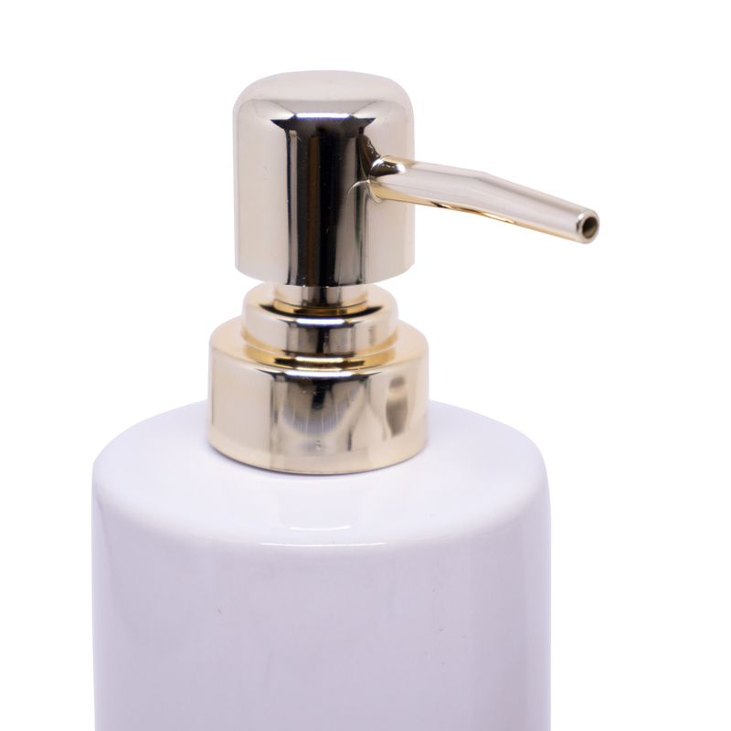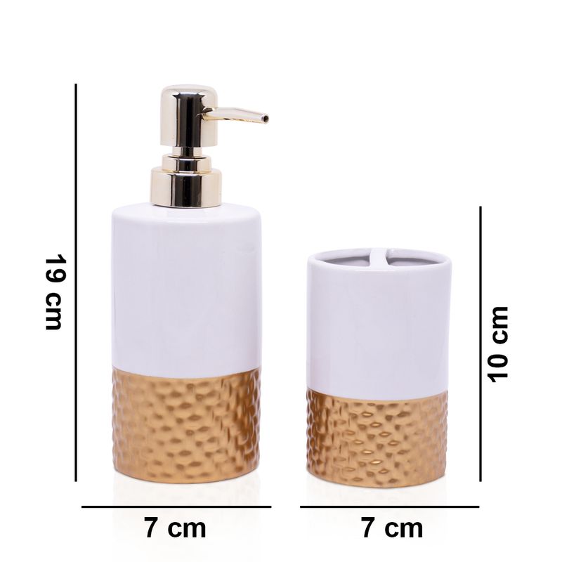 Descrição do ProdutoProcurando por uma decoração mais despojada e aconchegante para o seu banheiro? Com nosso Kit de Banheiro em Cerâmica Branco e Dourado, o ambiente fica mais organizado e com um toque luxuoso. Com detalhes em dourado e aplicador em pump, torna ainda mais fácil a higiene das mãos e melhor organização no ambiente. Adquira já o seu!Dimensões Sabonete LiquidoAltura total: 19 cmLargura total: 07 cmProfundidade total: 07 cmPeso: 0,250 kg Dimensões Porta EscovaAltura total: 10 cmLargura total: 07 cmProfundidade total: 07 cmPeso: 0,200 kg Especificações do ProdutoComposição: Cerâmica; Cor: Branco e Dourado;Montagem : O produto vai montado; Instruções de Limpeza: Utilizar um pano limpo e levemente úmido;Você irá receber: 01 volume;Garantia contra defeito de fabricação: No prazo de 30 (trinta) dias corridos a partir de recebimento, para defeitos como: produtos danificados, risco aparentes, peças faltando, o cliente tem direito a acionar a garantia caso entre em contato em no máximo 24 horas após o recebimento, e sempre enviar imagens do pacote recebido. Caso o cliente entre em contato após as 24 horas, será considerado que o problema foi causado por mau uso.Garantia de insatisfação: No prazo de 07 (sete) dias corridos a partir do recebimento (o cliente pode solicitar a devolução do valor ou a substituição do produto mediante a devolução do produtos recebido) Observações Relevantes- Todos os produtos vão embalados com total segurança- As cores dos produtos podem sofrer alterações dependendo do seu monitor;- As imagens são meramente ilustrativas, não acompanham objetos de decoração e eletros;- Confira as dimensões do produto no momento da compra e certifique-se de que passará normalmente por escadas, elevadores, portas e corredores.- Não nos responsabilizamos no ato da entrega por montagens, desmontagens, instalações de produtos, nem utilização de guinchos ou equipamentos similares para acesso a pisos superiores em apartamentos.- Observando as orientações acima, evita-se futuros desagrados ou imprevistos com a entrega do produto. Havendo despesas adicionais, serão de responsabilidade do cliente.