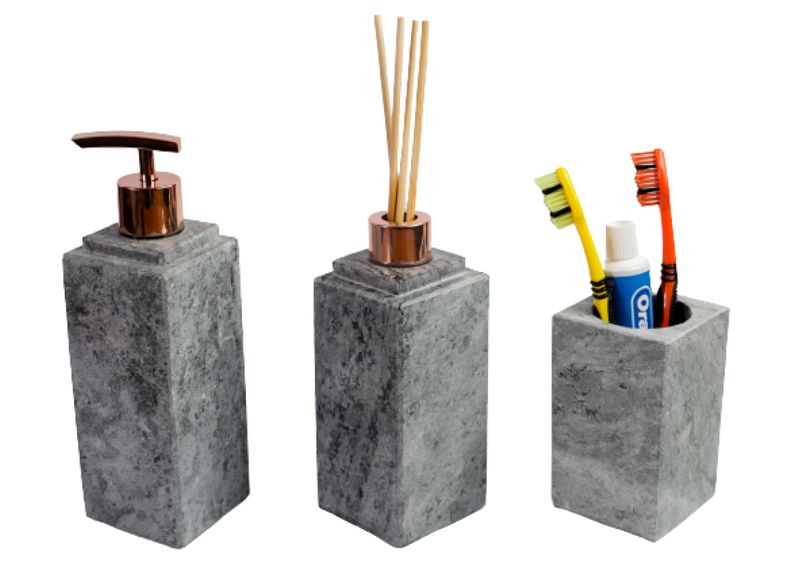 Kit Banheiro Bancada Lavabo Luxo em Pedra Sabão N01 Rosê O porta-escovas de dentes é um acessório muito comum nos banheiros para acomodar as escovas de dentes, creme dental, e até outros objetos. Um difusor ajuda a quebrar o óleo essencial de sua escolha em milhões de partículas minúsculas, que criam um vapor de água fino que se espalha por todo o seu espaço rapidamente. Na verdade, levará apenas alguns minutos para que toda a sala seja impregnada pelo aroma que você preferir. O porta sabonete líquido é uma criação muito prática e eficaz para o dia a dia. Afinal, no momento em que lavamos as mãos, basta apertar o porta sabonete líquido e teremos a quantidade necessária de sabonete para ensaboarmos. Especificações Técnicas Porta Sabonete Líquido: Altura da Pedra: 16cm. Altura Total: 22cm. Litragem: 250ml. Largura: 7cm. Peso: 1,1Kg. Especificações Técnicas Porta Escova de Dente: Diâmetro Furo Escova: 5cm. Largura: 7cm. Peso: 0,760g. Altura 11cm. Especificações Técnicas Difusor: Altura até na Pedra: 13cm. Altura Total: 16cm. Largura: 7cm. Peso: 0,930g. Itens Inclusos: 01 Porta Sabonete Líquido Dispenser em Pedra Sabão Rosê 22x7cm. 01 Difusor Vareta Essências Aromas Banheiro Ambiente Rosê 7cm. 01 Porta Escova de Dente Pia Bancada em Pedra Sabão 11x7cm. Código: 013+015+017-INDSJ.