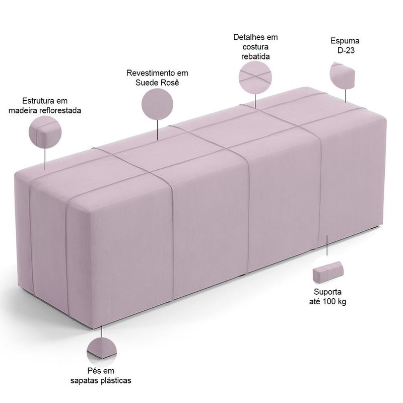 O Kit Cabeceira com Calçadeira Roma chegou para trazer a comodidade essencial para suas horas de descanso, além disso são elementos de destaque para qualquer quarto, proporcionando não apenas conforto mas também toques de elegância e requinte ao ambiente. Feito com materiais de alta qualidade, agregam um aspecto sofisticado e agradável ao toque, trazendo uma textura suave ao ambiente. Vale ressaltar seus detalhes em costura rebatida que elevam o charme das peças e incluem um acabamento impecável, sendo assim peças de arte que elevam o charme do ambiente aonde estiverem. Seja lendo, assistindo TV ou simplesmente descansando, suas superfícies estofadas lhe proporcionam um conforto excepcional, trazendo tranquilidade ao seu quarto. Adquira já o seu! Dimensões da Cabeceira (L x A x P) 160 x 120 x 8 cm Dimensões do Puff (L x A x P) 160 x 51 x 52 cm Dimensões do Frame (L x A x P) 5,5 x 13,5 x 16,5 cm Características da Cabeceira: Estrutura em Madeira reflorestada. Revestimento em Suede na cor Rosê, com acabamento semi brilho. Estofada com Espuma D-20. Acompanha todos os acessórios para fixação. Pés em sapatas plásticas. Características do Puff: Estrutura em Madeira Reflorestada. Revestimento em Suede na cor Rosê. Detalhes em Costura Rebatida, com ótimo acabamento. Estofado com Espuma D-23. Pés em Sapatas Plásticas. Características do Frame: Produzido em chapa de ferro 1,5 mm. Acabamento em esmalte PU na cor Alumínio. Acessórios para fixação: 04 Parafusos cabeça chata auto atarraxantes 5,0x25mm e 04 arruelas 1/4. - Por se tratar de estofado as medidas podem ter uma pequena variação de até 3 cm. - A tonalidade do produto real poderá ter ligeira variação devido o lote de tecidos. Observações importantes: - Produto para uso residencial em ambiente interno, não devendo ficar exposto diretamente ao sol, calor e umidade excessivos. - Pode haver alguma diferença de tonalidade entre a imagem e o produto real, por conta do tratamento de imagens e a calibração de cores do seu monitor. - As imagens são meramente ilustrativas, não acompanham objetos de decoração e eletrônicos. - Ao receber a mercadoria, o cliente deve verificar as condições da embalagem, caso haja alguma avaria não assine o comprovante de recebimento. - Montagem, desmontagem e outras instalações serão de responsabilidade do cliente. Não nos responsabilizamos, no ato da entrega, por subir escadas/elevadores ou pelo transporte por guincho em apartamentos. Eventuais despesas são de responsabilidade do comprador. - Confira as dimensões do produto e certifique-se de que passará normalmente por supostos elevadores, portas, escadas e/ou corredores de sua residência.