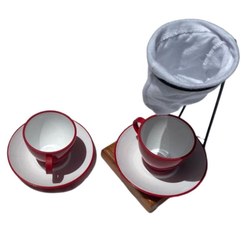 Conjunto de 2 xicarazinhas com pires e coador para voce curtir se café feito na hora sem desperdicio. Capacidade das xicaras : 50 ml Material da xicaras: PLASTICO Coador base de metal com MADEIRA DE DEMOLIÇÂO, artesanal