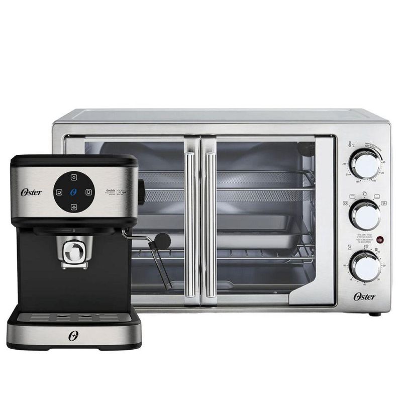 Kit Cafeteira Espresso Double E Forno e Fritadeira 42L French Door Oster 110VCafeteira Espresso Double Digital Oster – OCAF900A Cafeteira Espresso Oster combina tecnologia e design para oferecer uma extração perfeita em todos os sentidos. Com bomba de 20 bar e funções que permitem personalizar sua bebida, você vai saborear a experiência completa de um autêntico espresso em cada xícara.Destaques do Produto:Tecnologia e Praticidade:Sistema de bomba de 20 bar faz a melhor extração de sabor e cremosidade do café. Seu espresso com apenas um toque.Design Exclusivo e Funcional:Design sofisticado e cheio de estilo, equipado com painel touch e 4 funções pré-programadas (espresso curto, espresso longo, espumador de leite e liga/desliga).Delícias do Café ao Leite:Espumador de leite para criar cremosos cappuccinos, lattes e muitas outras opções de bebidas no ponto perfeito.Prepara até 2 Xícaras de Café de uma só vez:Saborear um autêntico espresso é uma experiência que fica melhor quando é compartilhada. Prepare duas xícaras de uma só vez com toda a tranquilidade.2 em 1 – Compatível com a sua Rotina:A Cafeteira Espresso Oster prepara um café saboroso do jeito que você preferir. Ela possui um acessório que permite o preparo com café em pó e também com cápsulas Nespresso.*E Mais:Potência 1100W, vaporizador de água quente para chás e aquecimento de xícaras, capacidade de 1,6L de água, sistema anti-aquecimento, porta-filtro para single e double espresso, 4 funções pré-programadas e personalizáveis.Especificações Técnicas – Cafeteira OCAF900:Modelo: OCAF900Potência: 1100WCapacidade do Reservatório de Água: 1,6LCompatibilidade: Café em pó e cápsulas Nespresso*Dimensões [LxAxP]: 218 x 273 x 289 mmSelo de Segurança: OCP ULGarantia (meses): 12Forno e Fritadeira Sem Óleo Oster 42L French Door 2 em 1 – TSSTTVFDMAFAPraticidade de dois produtos em um só. Seu novo aliado para receitas especiais. Maximize suas opções na cozinha com o Forno e Fritadeira sem óleo French Door da Oster. Seu design contemporâneo e funções pré-programadas proporcionam maior facilidade para suas receitas.Destaques do Produto:5 em 1:São 5 funções pré-programadas para tostar, assar, grelhar, assar por turbo convecção, esquentar e fritar sem óleo. Faça todos os seus preparos em um único produto.Função Fritar sem óleo:Inclui função para fritar sem o uso de óleo, o que possibilita preparos mais saudáveis.Função Convecção:Sua tecnologia para assar por convecção faz com que o ar quente circule por todo o forno, assando os alimentos de forma rápida e dourando de forma mais uniforme.Capacidade de 42 Litros:Possui 42 litros e sua capacidade pode ser duplicada, pois possui duas prateleiras. Ideal para o preparo de duas receitas ao mesmo tempo. Agora é possível preparar a entrada e o prato principal de uma só vez.Variação de Temperatura:Controle de temperatura ajustável de 90°C a 230°C que possibilita o preparo de carnes e uma grande variedade de alimentos na temperatura ideal.Exclusivo French Door:As portas possuem abertura compacta, ocupam menos espaço na bancada, deixando o espaço em frente às portas livre para utilizar de apoio para assadeiras e formas.Fundo Curvo para Assadeiras:O fundo curvo aliado aos 42 litros permite assar pizzas de até 40 cm. Muito mais aproveitamento de espaço e pizzas para a família inteira em poucos minutos.Acompanha Acessórios:Inclui bandeja, grelha e cesto para auxiliar em todos os preparos. Além da bandeja coletora de gordura, que traz praticidade para a limpeza.Especificações Técnicas – Forno/Fritadeira TSSTTVFDMAFA:Modelo: TSSTTVFDMAFACapacidade: 42 LitrosControle de Temperatura: De 90°C a 230°CDimensões [LxAxP]: 550 x 325 x 490 mmSelo de Segurança: OCP ULGarantia (meses): 12