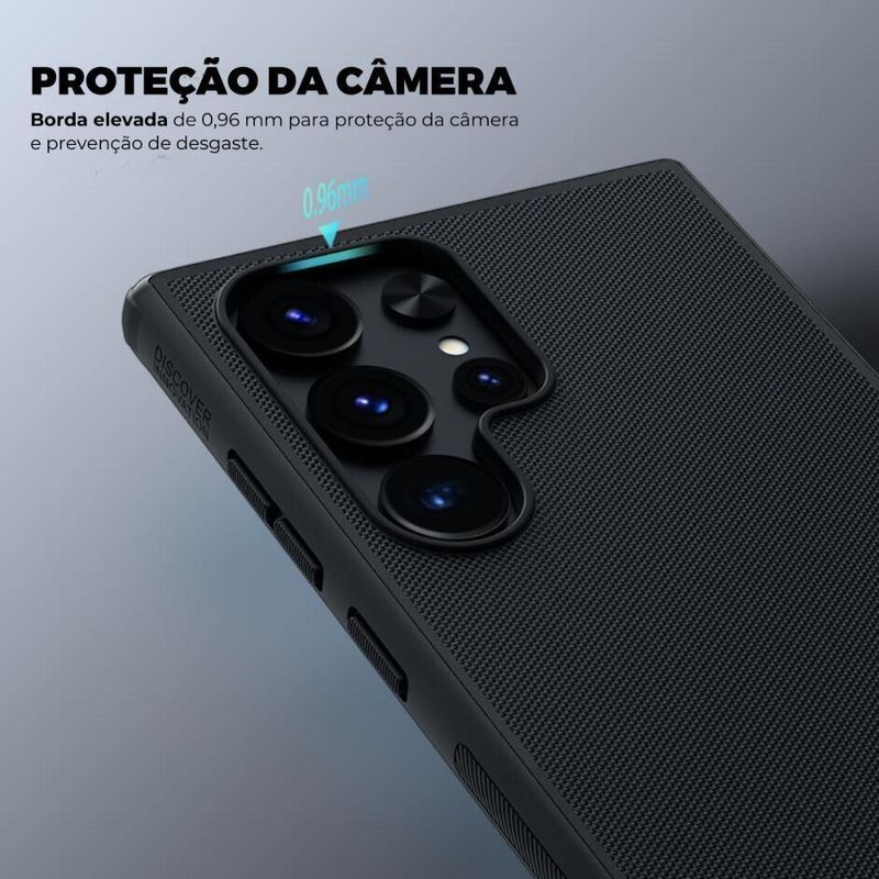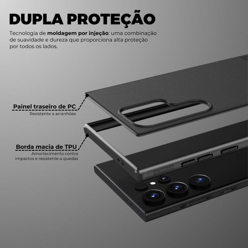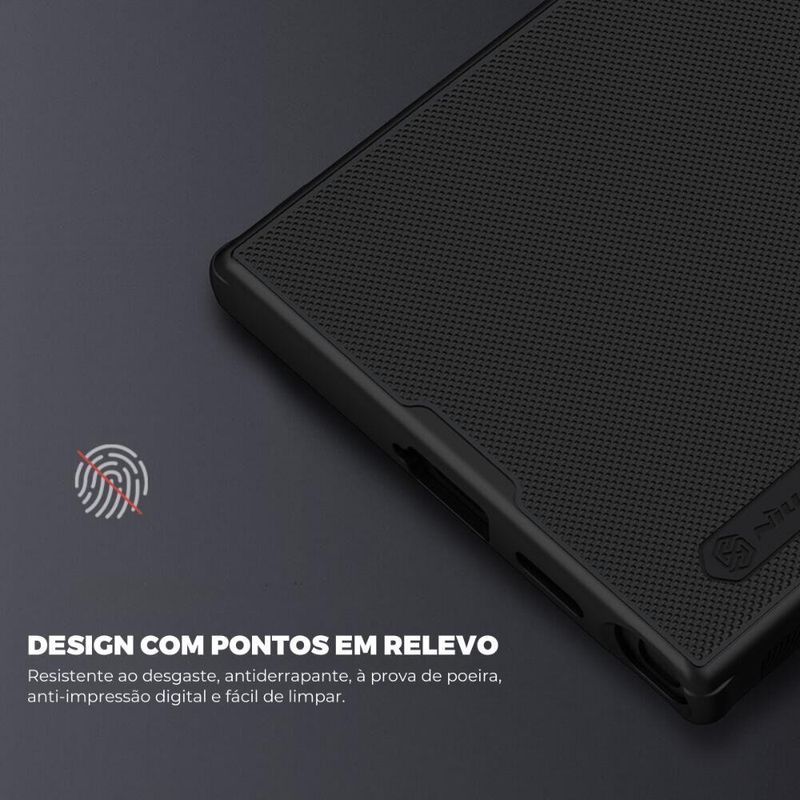 Kit Capa Case Capinha Nillkin Super Frosted + Película Hydrogel Hd Para Samsung Galaxy S23 Ultra - GshieldDESCRIÇÃO 1) A Capa Super Frosted da Nillkin é uma escolha premium para quem busca proteção e estilo. Construída com materiais duráveis de alta qualidade, como policarbonato rígido e acabamento fosco, a capa oferece uma aderência sólida e confortável, minimizando o risco de escorregões e quedas acidentais. O design fino e leve não compromete a proteção robusta contra impactos, arranhões e sujeira. Cada detalhe é cuidadosamente projetado para encaixar perfeitamente nos contornos do seu dispositivo, proporcionando acesso fácil a todas as portas e botões essenciais. Além disso, a superfície texturizada da Capa Super Frosted é resistente a impressões digitais, mantendo seu dispositivo com aparência limpa e nova por mais tempo. A capa não apenas protege seu dispositivo, mas também complementa seu estilo pessoal, tornando-a uma escolha ideal para quem valoriza funcionalidade, durabilidade e estética! 2) A Película de Hydrogel da Gshield oferece uma proteção avançada para a tela do seu Samsung Galaxy S23 Ultra, garantindo uma experiência duradoura e sem preocupações. Desenvolvida com a inovadora tecnologia hidro nano pet e TPU Soft Gel, essa película é resistente contra riscos indesejados. O revestimento oleofóbico da película não apenas aprimora a resistência contra arranhões, mas também reduz as marcas de digitais na tela, proporcionando uma visão clara e nítida em todos os momentos. A adaptação perfeita às extremidades curvadas do seu dispositivo assegura uma cobertura completa do visor, preservando a estética e funcionalidade do aparelho. Escolher a Película de Hydrogel Gshield é optar por um escudo de proteção sofisticado, que une tecnologia de ponta e durabilidade para manter a tela do seu celular impecável. Cuide do seu Samsung Galaxy S23 Ultra com estilo e confiança, investindo na excelência em proteção que só a Gshield proporciona. ESPECIFICAÇÕES Capa Marca: Nillkin Material: PC e TPU Dimensões: Dimensões exatas do aparelho Proteção: Contra impactos e riscos Cor: Preta Película Hydrogel HD Material: Hidro nano pet + TPU Soft Gel Marca: Gshield Espessura: 0,19mm Proteção: Contra pequenos impactos e riscos à tela Grau de transparência: 97% High Definition Certificações: US Military Dimensões: Cobre todas as dimensões do aparelho, podendo haver pequenos recuos para melhor a aderências nas laterais. COR: ÚNICA