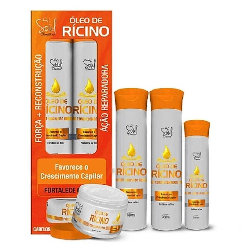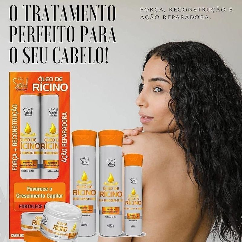 Kit Capilar óleo De Rícino 04 Itens Soul CosméticosO Kit Capilar Óleo de Rícino Soul Cosméticos é a escolha ideal para quem deseja cabelos mais fortes, hidratados e com brilho intenso. Composto por quatro produtos poderosos ? Shampoo, Condicionador, Máscara Capilar e Leave-In, todos formulados com óleo de rícino, um ingrediente natural altamente eficaz para fortalecer os fios, promover o crescimento saudável e prevenir a queda. Este kit é adequado para todos os tipos de cabelo, oferecendo uma experiência de cuidado completa e profunda.Contém:01 Shampoo Óleo de Rícino Soul Cosméticos 380ml01 Condicionador Óleo de Rícino Soul Cosméticos 380ml01 Máscara Capilar Óleo de Rícino Soul Cosméticos 300g01 Leave-In Óleo de Rícino Soul Cosméticos 200ml Benefícios do Óleo de Rícino:Fortalecimento e Crescimento Capilar: Rico em ácidos graxos essenciais e E, o óleo de rícino fortalece os fios e estimula o crescimento saudável do cabelo. Hidratação Profunda: Nutre profundamente a fibra capilar, combatendo o ressecamento e proporcionando cabelos hidratados e suaves. Prevenção da Queda: Ajuda a prevenir a queda e a quebra dos fios, deixando o cabelo mais resistente. Brilho e Maciez: Proporciona brilho intenso e maciez, melhorando a aparência geral dos fios. Proteção: Suas propriedades antioxidantes protegem os fios contra danos ambientais e agressões externas. Modo de Usar:Shampoo: Aplique nos cabelos molhados, massageando suavemente até formar espuma. Enxágue bem. Condicionador: Após o uso do shampoo, aplique o condicionador nos fios úmidos, distribuindo uniformemente. Deixe agir por alguns minutos e enxágue. Máscara Capilar: Após lavar com o shampoo, aplique a máscara nos fios úmidos, massageando mecha por mecha. Deixe agir de 5 a 10 minutos e enxágue bem. Leave-In: Após a lavagem, aplique o leave-in nos cabelos úmidos, distribuindo bem pelos fios. Não enxágue. Finalize como desejar. Precauções e Composição:Precauções: Evite o com os olhos. Em caso de acidental, lave imediatamente com água abundante. Mantenha fora do alcance de crianças. Composição: Contém óleo de rícino e outros ingredientes hidratantes e nutritivos. Livre de parabenos e sulfatos agressivos. Informações Adicionais:Não testado em animais. Embalagens recicláveis. Indicado para todos os tipos de cabelo.