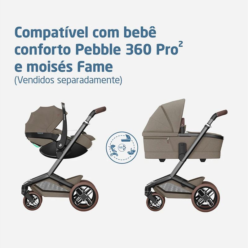 Kit Carrinho de bebê Fame Twillic Truffle + Bebê Conforto Pebble Pro - Maxi Cosi O Maxi-Cosi Fame é um verdadeiro ícone de design, projetado para oferecer níveis luxuosos de conforto tanto para os bebês quanto para os pais. Seus detalhes premium, design sem costuras, estética moderna e recursos inovadores foram desenvolvidos para resistir ao tempo. Um carrinho pioneiro que leva as famílias de hoje ao futuro. O Maxi-Cosi Fame é o carrinho que combina luxo, inovação e funcionalidade, ideal para pais que buscam mobilidade sem abrir mão do conforto e das tecnologias mais avançadas no cuidado com a família. Com um design icônico e acabamentos premium, o Fame é perfeito para acompanhar famílias em todos os momentos e lugares. Seu assento de primeira classe, com espuma HD (alta densidade) e apoio ergonômico garante o máximo de aconchego, e a tecnologia ClimaFlow traz o conforto térmico e bem-estar para o bebê desde o nascimento. Além disso, o Fame conta com o inovador sistema LumiRide, um sistema de iluminação integrada que aumenta a visibilidade e a segurança em locais com pouca luz. O mecanismo de fechamento do Fame é um grande diferencial: permite dobrar o assento em qualquer direção, tornando o uso muito mais prático para os pais. Robusto e projetado para durar, ele é compatível com o bebê conforto Pebble 360 Pro² da família SlideTech® e também com o Moisés Fame (vendidos separadamente), garantindo praticidade em todas as fases da infância. Fechamento inovador com assento dobrável em ambas as direções [ Assento ergonômico com espuma HD e tecnologia Climaflow, sendo possível remover o redutor para máxima ventilação em dias mais quentes Prático encaixe do assento diretamente na estrutura sem a necessidade de adaptadores Capota extensível com janela de ventilação, visor peek-a-boo aba de sol e UV 50+ Sistema de iluminação LumiRide para maior segurança e praticidade Compatível com bebê conforto Pebble 360 Pro² para travel system e moisés Fame para os primeiros meses do bebê (vendidos separadamente) Rodas robustas com suspensão CosiCruise para maior estabilidade e pneus à prova de furos, garantindo passeios suaves em qualquer terreno Cesto espaçoso com capacidade para até 10 kg Sistema de cinto magnético de 5 pontos Easy-in para instalação super prática Altura de assento ideal para mesas, perfeito para momentos em família Barra ajustável para pais com diferentes alturas. Freio intuitivo de toque único para controle fácil e seguro Acompanha mosquiteiro Posição totalmente reclinável para máximo conforto do bebê Peso do produto: 15,2 kgs Desde RN até 22 kgs Dimensões Externa do Produto (A x L x P | cm)110 x 61,5 x 86,5 Dimensões do Produto Fechado67,5 x 61,5 x 47,5 Registro do Inmetro: 000303/2025 Bebê Conforto Pebble 360 Pro²: Segurança e tecnologia no nível máximo Tecnologia inovadora SlideTech™: Nossa revolucionária tecnologia de cadeirinha de carro deslizante combinada com a rotação de 360° com uma só mão para tornar cada dia mais fácil para os pais. Simplesmente deslize, gire e vá! Posição completamente reclinada: O Pebble 360 Pro² reclina em uma posição completamente reclinada em todos os modos para o máximo conforto de sono – no carro ou acoplado a um carrinho de bebê. ClimaFlow para controle de temperatura: Projetado com painéis de ventilação, espuma respirável e tecidos de malha tecnológica para uma circulação de ar aprimorada, garantindo que seu filho fique confortável. Cinto Easy-in O Pebble 360 Pro² apresenta cinto com Easy-in que fica aberto e na posição perfeita, para que você possa colocar e tirar seu filho do carro sem esforço. Proteção contra impactos laterais GCELL: A proteção contra impactos laterais G-CELL oferece ao seu filho uma segurança inigualável, distribuindo o impacto e reduzindo lesões em caso de colisão. Design ergonômico: O design ergonômico do Pebble 360 Pro² garante que seu bebê mantenha uma postura correta e confortável, apoiando o desenvolvimento saudável da coluna vertebral. Dados técnicos: Grupos Classificação: i-Size: 40 a 87cm (Grupos 0+,1,2 e 3) Instalação: Cintos de 3 pontos do veículo ou Sistema Isofix (com a base inclusa) Reclinável: Sim Redutor de assento: Redutor especial ergonômico para os recém-nascidos Cinto de segurança: 3 pontos com protetores acolchoados e sistema easy-in que facilita a colocação Isofix: Quando instalado com base inclusa Material/Composição Bebê conforto: Poliéster, PU, PP, PA, POM, PAGF, Aço | Base: PP. PA, PAGF, POM, Aço, Alumínio, ABS, TPE Acompanha base Base FamilyFix 360 Pro Peso do Produto Bebê conforto: 5,2 | Base: 8,6 Dimensões Externa do Produto (A x L x P | cm) Bebê conforto: 73 x 33 x 45 | Base: 87,6 x 39,1 x 65,4 Registro do Inmetro : 001674/2024