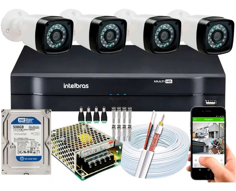 Itens inclusos 01 - DVR Stand Alone Multi HD Intelbras MHDX - 4 Canais 1080p Lite + 1 Canal 2mp IP 01 - HD 500gb 04 - Câmera Full HD 720p Importada Bullet AHD 01 - Cabo Coaxial Flexível RF4mm + Bipolar 2x26 AWG, 85% Malha, com 50mts 01 - Fonte Estabilizada 12V 5A, Ideal para câmeras de segurança 08 - Conector BNC Macho com Mola de parafuso 04 - Conector P4 de Borne para Alimentação 12V DVR Stand Alone Multi HD Intelbras MHDX - 4 Canais 1080p Lite + 1 Canal 2mp IP Os novos gravadores digitais Intelbras Multi HD® são compatíveis com os protocolos HDCVI, AHD, HDTVI, IP e analógico. Desenvolvidos com a qualidade da marca líder no segmento de segurança eletrônica da América Latina, os gravadores digitais de vídeo são a solução que faltava para tornar seu projeto de CFTV ainda mais completo Características: Compatível com 5 tecnologias: HDCVI + HDTVI + AHD + analógica + IP Visualização em 1080p Gravação de todos os canais em 1080p Lite ou 720p Saídas de vídeo VGA, HDMI e BNC Reprodução em tempo real, detecção de movimento e busca por movimento Compatibilidade com protocolo de comunicação Onvif Suporta 1 disco rígido de até 10 TB Função BNC + IP: adiciona câmeras IP ao DVR Modo NVR: transforma todos os canais BNC em IP MHDX 1104 compatível com redes Wi-Fi através de adaptador USB 04 - Câmera HD 720p Importada Bullet AHD - AHD Usufrua de uma câmera de vídeo com resolução HD e transmissão com cores ricas, reais e sem perda de cores, com fácil instalação se adapta a maioria dos ambientes. Características: Resolução de 1MP 720p Compatibilidade com as tecnologias AHD, HDTVI e HDCVI Fácil manuseio e fácil instalação Alcance IR de até 20 metros Lente 2,8mm Sensor de 1/4 **IMAGEM MERAMENTE ILUSTRATIVA**