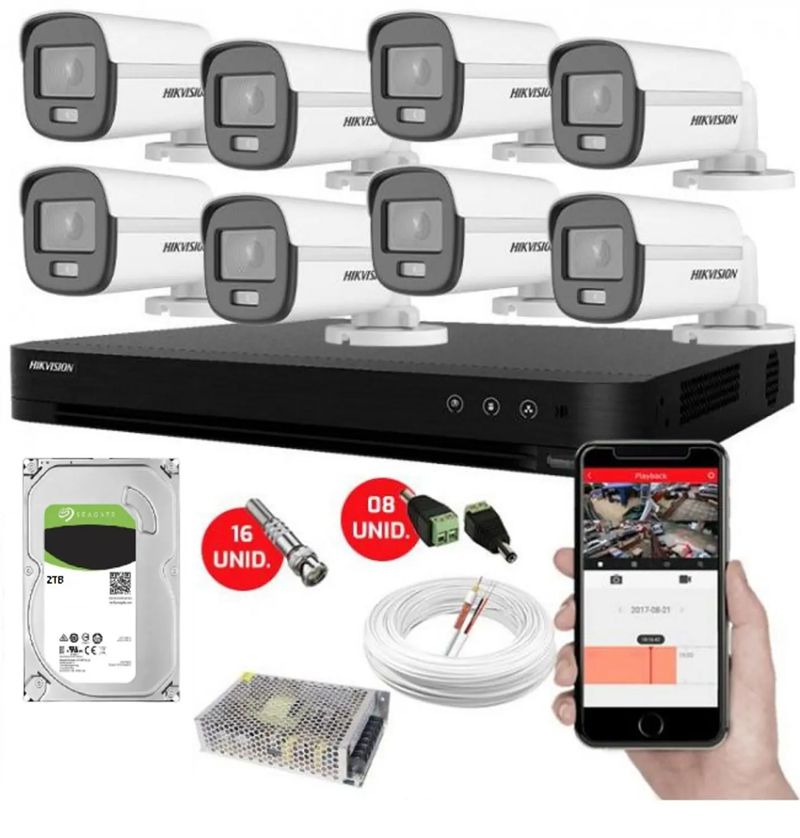 Kit CFTV 8 Câmeras de Segurança Hikvision Colorvu Imagens Noturnas Coloridas Full HD 1080p c/hd 2TB Itens Inclusos: 01un. DVR Hikvision Gravador 8 Canais iDS-7208HGHI-K1/S Inteligência AcuSense 01un. Hd 2TB Wd ou Seagate 08un. Câmera Hikvision ColorVu DS-2CE10DF0T-PF Infravermelho Colorido Full HD 1080p 01un. Rolo de 100m de Cabo de câmera RF 4mm Blindado + Bipolar Externo 01un. Fonte Eletrônica Chaveada 12V 10A Multicâmera Bivolt CFTV 16un. Conector BNC Mola Parafuso para conexão de vídeo das câmeras e DVR 08un. Conector P4 Macho de Borne para conexão de alimentação das câmeras
