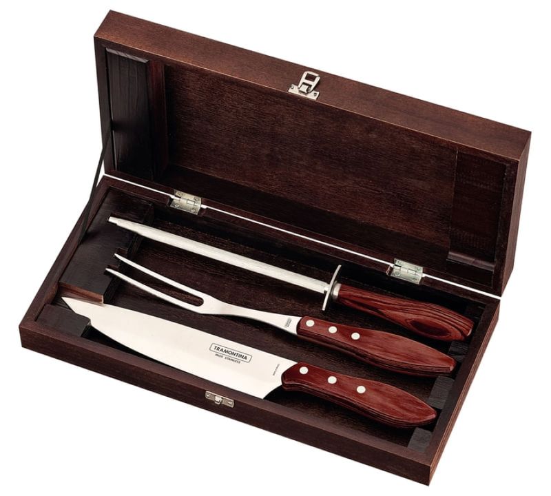 O Kit para Churrasco Tramontina em Aço Inox Cabo Vermelho Polywood com Estojo de Madeira 4 Peças impõe respeito e admiração. Um belíssimo kit da linha Churrasco com faca para carne e garfo trinchante com lâminas em aço inox e chaira com haste de aço carbono cromado. Com cabos de madeira tratada Polywood, que deixam as peças ainda mais bonitas e resistentes à impactos e altas temperaturas. Para acompanhar e trazer esse ar rústico para qualquer ambiente, conta estojo de madeira.Descrição técnicaAs lâminas da faca e do garfo são de aço inox. A lâmina da faca têm maior durabilidade do fio devido ao tratamento térmico. A lâmina do garfo conta com maior espessura e uma estampagem do aço que garante maior resistência, evitando deformações. Chaira com haste de aço carbono revestida com cromo-duro que garante uma maior durabilidade e precisão para a afiação. Os cabos de madeira tratada Polywood são resistentes à impactos e alta temperaturas garantindo maior resistência e durabilidade. Rebites de alumínio. Estojo de madeira que oferece uma proteção ao fio da faca, permitindo o transporte e armazenagem com maior segurança. Podem ir à máquina de lavar louças facilitando seu dia a dia.Orientação GeralTenha cuidado ao manusear produtos cortantes e perfurantes e mantenha-os fora do alcance das crianças. Para maior durabilidade dos produtos recomenda-se secar bem antes de guardar, mesmo após lavagem em máquina. Para descarte dos produtos e embalagens siga as orientações de reciclagem vigentes. Garantia do produto: 90 dias de garantia de acordo com o Código de Defesa do Consumidor + a Garantia do Fabricante