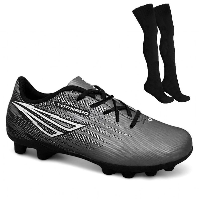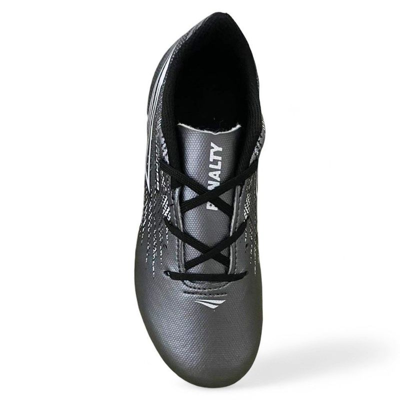 Descrição:Com a Chuteira Campo Penalty Tornado Infantil você irá criar jogadas extraordinárias em suas partidas. Trazendo o cabedal produzido em material sintético, o produto proporciona alta durabilidade, além de reduzir a absorção de água. O reforço na região do calcanhar previne lesões e oferece mais estabilidade e segurança, sendo perfeito para as arrancadas no jogo. Já o solado em PVC traz a presença de travas altas e fixas, elevando a aderência nos campos de grama natural. Seu fechamento por cadarços com lingueta flexível dispõe de uma regulagem ideal, evitando desconfortos durante os treinos e jogos. Por fim, traz a tecnologia Hiperflex, onde canaletas são posicionadas estrategicamente para auxílio na flexão e movimentação dos pés. Já o meião foi produzido em um tecido especial de poliamida com poliéster e elastano, por isso, ele é perfeito para quem busca uma peça elástica e ao mesmo tempo extremamente leve e muito confortável. Seu design todo liso na cor preta, possibilita assim, uma maior versatilidade ao montar seus uniformes. O tamanho do meião vai variar de acordo com a numeração da chuteira. TECNOLOGIAS: Hiper Flex: assegura flexibilidade máxima, facilitando a execução de dribles e jogadas rápidas. Micropower: Essa chuteira proporciona resistência e suporte durante o jogo, garantindo que as crianças possam se movimentar com confiança.