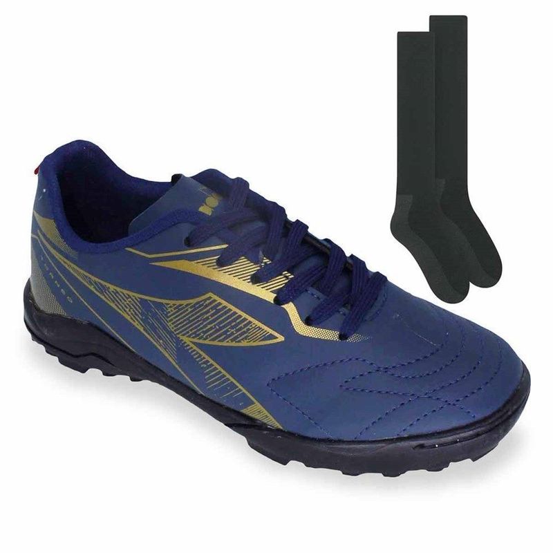 Descrição:Explore o mundo do futebol com estilo e confiança! Apresentamos a Chuteira Society Diadora Torneo Infantil, uma escolha perfeita para jovens craques que buscam desempenho e design incríveis. Cabedal resistente em material sintético para maior durabilidade. Solado de borracha com travas fixas para campos society, fornecendo excelente tração e estabilidade no campo. Fechamento com cadarço para um ajuste seguro e personalizado. Palmilha em EVA para conforto a cada passo. Lingueta fina e flexível para facilitar o cálculo. Forro têxtil que mantém os pés confortáveis durante toda a partida. Além do desempenho impecável, o design marinho e dourado da Diadora Torneo Infantil vai fazer seu filho se destacar no campo, combinando estilo e funcionalidade em um único calçado. O Meião Futebol é ideal para quer completar seu uniforme para suas partidas. Este meião foi produzido em um tecido especial de poliamida com poliéster e elastano, por isso, ele é perfeito para quem busca uma peça elástica e ao mesmo tempo extremamente leve e muito confortável. Seu design traz uma única cor, possibilitando assim, uma maior versatilidade ao montar seus uniformes. Medida Aproximada (cm): 39-43: 22x44x10 (Comprimento do Pé x Altura do Cano x Largura do Cano). Referência: DFAF105-03