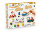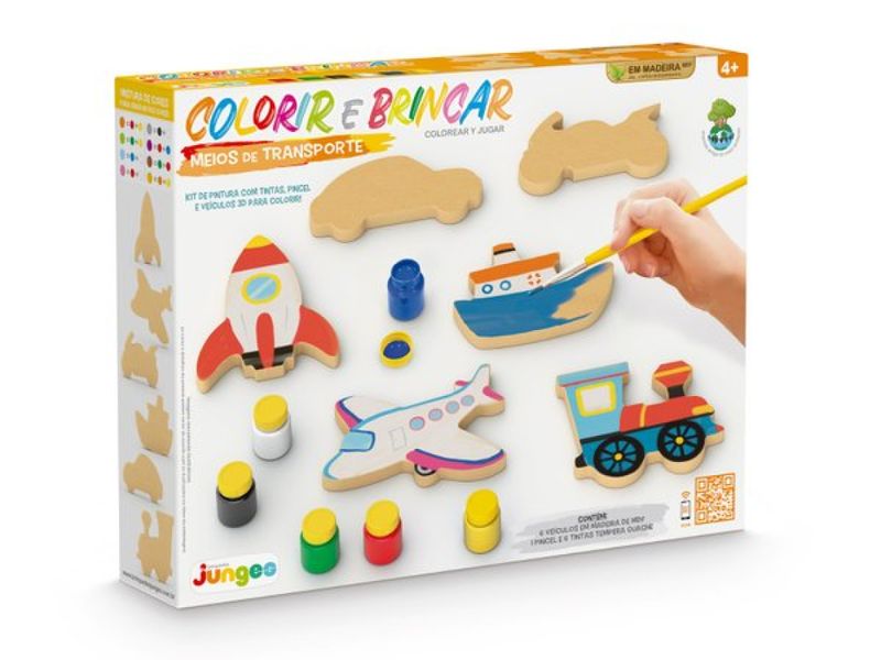 Kit Colorir e Brincar - Meios de Transportes - Kit colorir e brincar da Junges com 6 veículos em madeira de MDF. Acompanha 6 tintas temperas e 1 pincel para os pequenos artistas se divertirem muito! Ideal para a criança aprender as cores e desenvolver a coordenação e a imaginação! Características Gerais do Produto: • Faixa Etária: +4 • Faixa Etária: 1 a 5 anos de idade • Marca: Brinquedos Junges • Material: Madeira em MDF Acompanha o produto: • 6 veículos em madeira de MDF 6 tintas temperas 1 pincel para os pequenos artistas Garantia: • 7 dias de garantia