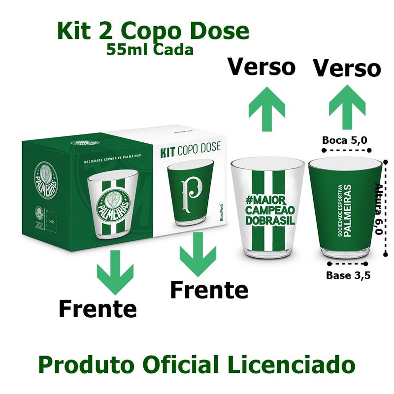 O Copo Dose Kit C/ 2un - Time Palmeiras da marca Brasfoot é perfeito para os torcedores apaixonados pelo time.Produzido em vidro, possui capacidade de 55 mL e é ideal para servir tequila,cachaça e vodka. Com o desenho do escudo do seu time do coraçao, é um item indispensável para os momentos de comemoração.kit Copo Dose Iron BrasFoot Vidro 2 Unidades 360 Licenciado Palmeiras 55ml BrancoTodas as informações divulgadas são de responsabilidade do fabricante/fornecedor.Marca: BrasFootClassificação: Copo DoseMaterial: VidroConteúdo e Medidas: Kit Copo Dose em Vidro 360 Iron - Brasão - Palmeiras - 02 Peças.Tamanho Aproximado Produto( Boca Ø 5,0cm - Altura 6,0cm - Base 3,5cm)Capacidade: 55ml Cada.O Kit Copo Dose vai em uma caixa Litografada personalizada e é um Produto Oficial licenciado.Cuidados:? Lavar com sabão e esponja macia.? Não utilizar produtos abrasivos.? Evitar choques térmicos, quedas e impactos que podem danificar o produto.Produto Original Oficial Licenciado por BrasFootColeção / Sortimento: Clubes de FutebolEstampada: SimCor: TransparenteReferencia: 13330Código de Barra: 7899790277012Garantia(Fabricante): Contra Defeito de FabricaçãoImagens Meramente IlustrativasINFORMAÇÕES IMPORTANTES: Item composto apenas por 02 Copo Dose, os demais itens são meramente decorativos e NÃO fazem parte do conteúdo da embalagem.Aviso : - Todas as medidas são valores aproximados e podem sofrer alguma variação.- As cores podem sofrer uma pequena variação, dependendo do lote do produto e das configurações do seu computador.