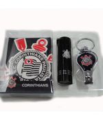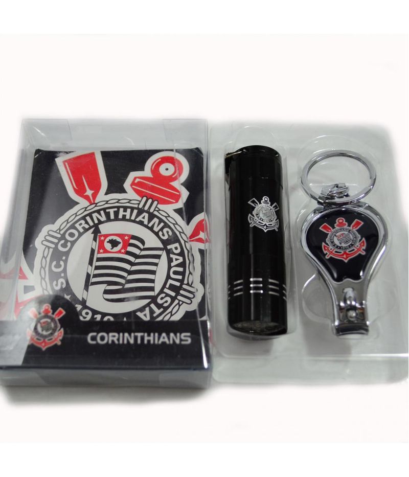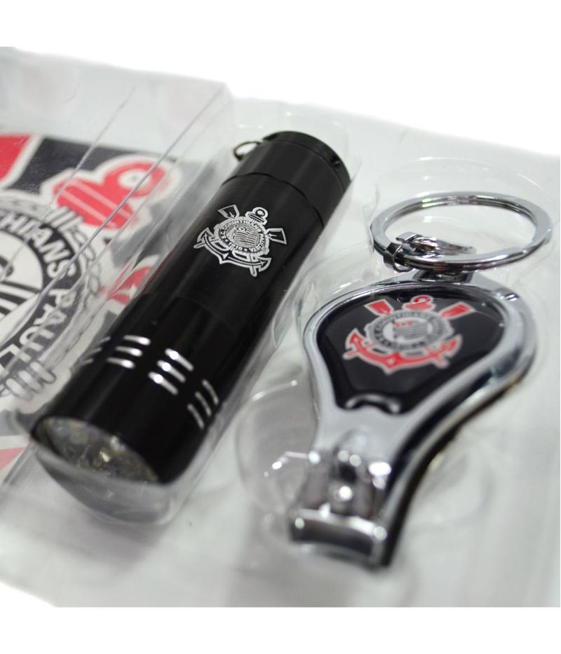 Kit Corinthians Com Chaveiro Lanterna e Cortador de Unha Super jogo contendo uma lanterna com 9 lâmpadas na cor branca e um chaveiro de metal equipado com cortador de unha e abridor de garrafas, tudo isso customizado com com a cor preta do Corinthians e marcado com o brasão do Timão. Material chaveiro: metal; Material lanterna: plástico; Funcionamento: 3 pilhas AAA