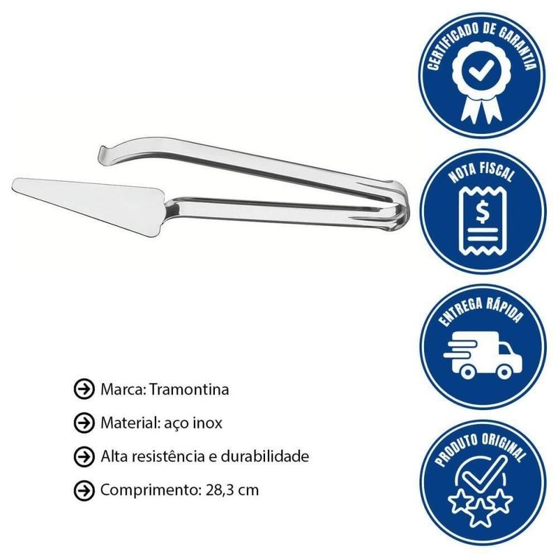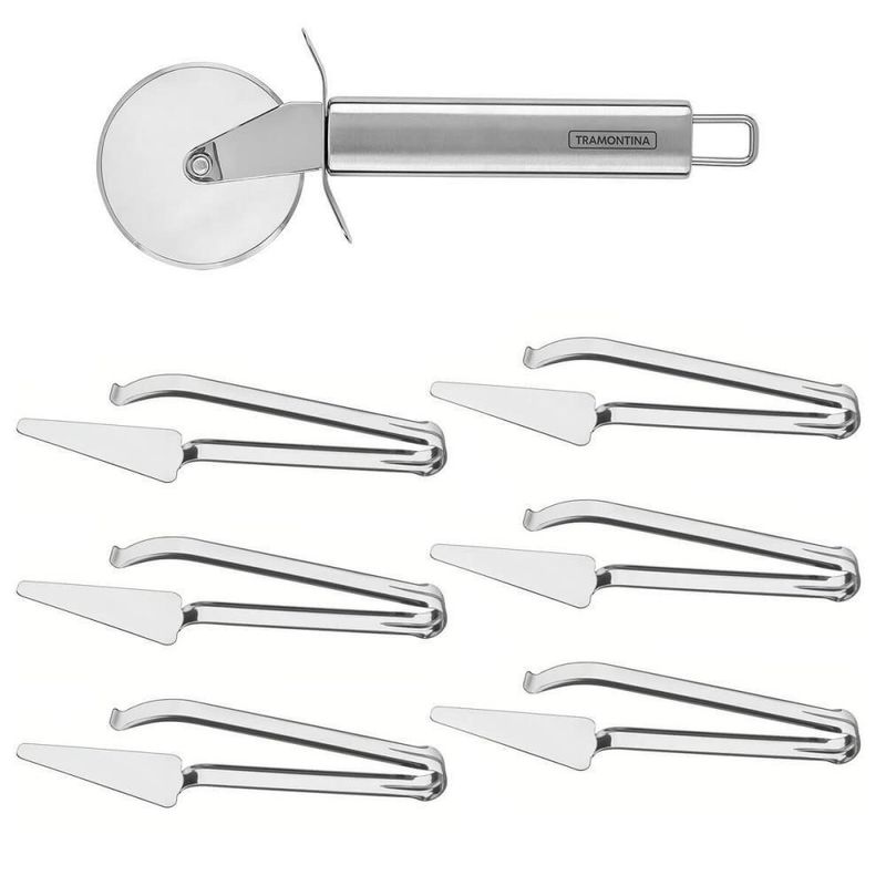 Kit Cortador De Pizza Tramontina Marffim + 6 Pegadores Para Pizza Tramontina UtilityKIT COMPOSTO POR:06 UN - PEGADOR PARA PIZZA TRAMONTINA UTILITY EM AÇO INOX 6380086201 UN - CORTADOR DE PIZZA TRAMONTINA MARFFIM EM AÇO INOX 63809130- Desfrute de momentos deliciosos e práticos com o Kit Cortador de Pizza Tramontina Marffim em Aço Inox + Pegador para Pizza Tramontina Utility. O cortador, feito 100% em aço inox, garante cortes perfeitos e rápidos, preservando a beleza e a durabilidade.- O pegador oferece firmeza e agilidade ao servir, tornando cada fatia um gesto de facilidade e elegância.- Além de funcionais, ambos são laváveis em máquina de lavar louças, mantendo sua cozinha organizada e seu tempo otimizado.- Transforme seu jeito de saborear pizza com praticidade e estilo incomparáveis!CORTADOR DE PIZZA TRAMONTINA MARFFIM EM AÇO INOX 63809130Marca: TramontinaModelo: Marffim Em Aço Inox 63809130DESCRIÇÃO DO CORTADOR DE PIZZA- Compartilhar uma deliciosa pizza com a família e com os amigos é sempre um prazer, e para isso, na hora de cortar e dividir as fatias, utilize o Cortador de Pizza Tramontina Marffim em Aço Inox.- A peça é feita totalmente de aço inox, apresenta alta resistência e durabilidade e vai deixar os seus momentos ainda mais funcionais e práticos.- A escolha ideal para apreciar pizzas na medida certa!INFORMAÇÕES DO CORTADOR DE PIZZA- Totalmente feita de aço inox, por isso não solta nenhum resíduo nos alimentos, mantendo-os saudáveis.- Altamente durável, mantém suas características originais, preservando a beleza, a higiene e a durabilidade do material.- Pode ser lavada diariamente na máquina de lavar louças.ORIENTAÇÕES DO CORTADOR DE PIZZA- Use apenas sabão ou detergente e uma esponja macia. Outros tipos de produto como palha de aço, poderão riscar ou prejudicar o brilho da peça.- Enxágue cada item a fim de remover totalmente os resíduos dos produtos de limpeza, que, por serem abrasivos, podem danificar o inox.- Sempre que possível, use água quente, pois renova o brilho da peça.- Após a lavagem, enxugue imediatamente a peça, caso contrário, as substâncias químicas da água (cloro) poderão causar manchas.- Evite atrito entre as peças durante o processo de lavagem e no armazenamento, para mantê-la sem riscos.- Evite o contato do produto com superfícies quentes, pois elas provocam a descoloração do material.- Não guarde a peça em locais úmidos. A umidade também provoca manchas.PESO- 0.084 kgGARANTIA- 90 dias de garantia legal para vícios ou defeitos de fabricação.DIMENSÕES- Dimensões da embalagem (Compr. X Larg. X Alt.): 243x80x28 mm- Dimensões do produto (Compr. X Larg. X Alt.): 192x72x15 mmPEGADOR PARA PIZZA TRAMONTINA UTILITY EM AÇO INOX 63800862Marca: TramontinaModelo: Utility Para Pizza em Aço Inox 63800/862DESCRIÇÃO DO PEGADOR DE PIZZA TRAMONTINA EM AÇO INOX- Servir as melhores receitas de pizza vai ficar muito mais moderno e gostoso com o Pegador para Pizza Tramontina Utility em Aço Inox.- Produzido totalmente em aço inox com acabamento brilho, leva mais praticidade e bom gosto na hora de servir.- Fácil de lavar, pode ser levado à máquina de lavar louças diariamente.- Um item para levar beleza e elegância à sua mesa!INFORMAÇÕES GERAIS DO PEGADOR DE PIZZA TRAMONTINA EM AÇO INOX- Em aço inoxidável, altamente durável, mantém as características originais, preservando a beleza, a higiene e a durabilidade do material.- Acabamento em brilho.- Pode ser lavado, diariamente, na máquina de lavar louças.RECOMENDAÇÕES DE USO DO PEGADOR DE PIZZA TRAMONTINA EM AÇO INOX- Use apenas sabão ou detergente e uma esponja macia. Outros tipos de produto como palha de aço, poderão riscar ou prejudicar o brilho da peça. Enxágue cada item a fim de remover totalmente os resíduos dos produtos de limpeza, que, por serem abrasivos, podem danificar o inox. Sempre que possível, use água quente, pois renova o brilho da peça. Após a lavagem, enxugue imediatamente a peça, caso contrário, as substâncias químicas da água (cloro) poderão causar manchas. Evite atrito entre as peças durante o processo de lavagem e no armazenamento, para mantê-la sem riscos. Evite o contato do produto com superfícies quentes, pois elas provocam a descoloração do material. Não guarde a peça em locais úmidos. A umidade também provoca manchas.PESO- 0,09 kgGARANTIA- 90 dias de garantia legal para vícios ou defeitos de fabricação.DIMENSÕES- Dimensões Produto (Compr. X Larg. X Alt.): 283x 50x 67 mm.