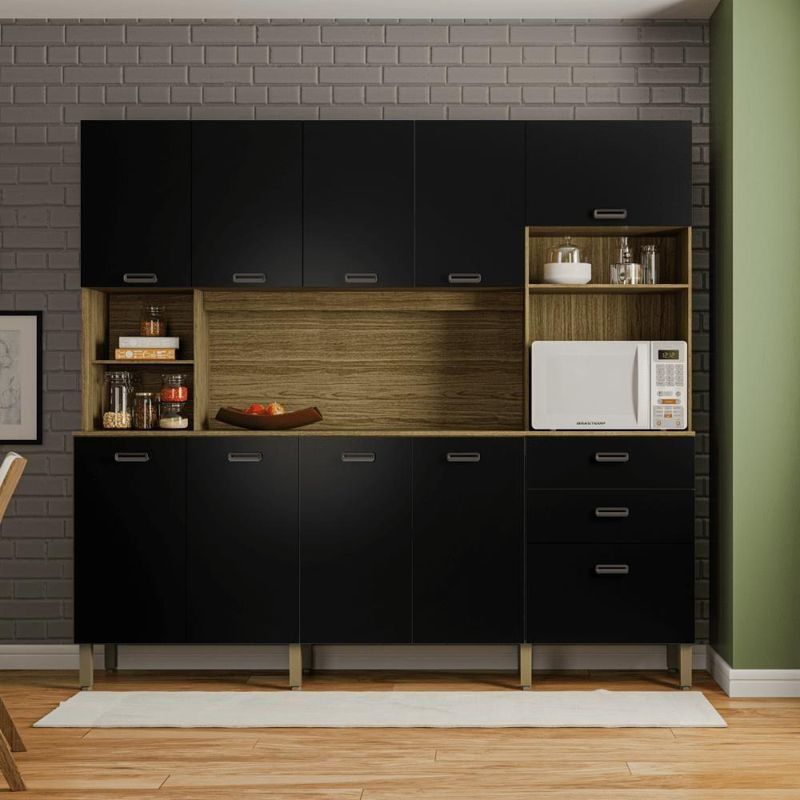 Kit Cozinha Armários E Portas Intense Freijó NeroCom altura de 204,5 cm, largura de 222,2 cm e profundidade de 46,8 cm garantem que a cozinha Intense seja uma das maiores do mercado de Kits e cozinhas práticas. E o melhor: a instalação e a montagem são rápidas e fáceis, sem precisar furar a parede para fixação, o que faz toda a diferença para para você. Além disso, a cozinha prática Intense conta com 3 nichos decorativos que permitem personalizar a decoração da cozinha e guardar itens do dia a dia, deixando o ambiente ainda mais bonito e funcional. E não podemos esquecer do nicho para forno elétrico ou micro-ondas, com um espaço amplo para garantir a praticidade na hora de cozinhar e utilizar no dia a dia. Mas não é só isso. As duas amplas gavetas com corrediças telescópicas são um verdadeiro show à parte, proporcionando um deslize suave e sem esforço, sem contar que são super espaçosas e garantem a organização dos utensílios da cozinha.Os pés com regulagem, os puxadores em ABS com pintura inox e as portas em 15 mm de espessura garantem resistência e durabilidade, além de um design moderno e sofisticado.Informações do produto:Altura: 204,5 cmLargura: 222,2 cmComprimento: 46,8 cmPortas: Sim (10)Gavetas: Sim (2)Prateleiras: Sim (4, internas)Nichos: Sim (4)Pés: Sim (8)Cor: Freijó NeroItens inclusos:01 ArmárioKit completo para montagem e manual de instruçõesGarantia: 3 meses.Informações Complementares:- Verificar o tamanho e detalhes do produto antes da compra.- Fotos meramente ilustrativa.- A transportadora entregará o produto no andar térreo do endereço de entrega.- Avaliar a mercadoria no ato do recebimento e recusar em caso de divergência ou avarias.- Não nos responsabilizamos pela montagem e desmontagem do produto no ato da entrega e devolução, assim como os custos gerados nestas situações.- Sugerimos a contratação de um montador profissional para a montagem do produto. Não nos responsabilizamos por avarias causadas no ato da montagem. Acompanha Colchão: Sem Colchão | Modelo: Vibrante | Material para Filtro: MDP | Tipo de Cama/Cabeceira: Padrão | Width: 75 | Altura do Produto com Embalagem (cm): 23 | Height: 23 | Peso Produto Com Embalagem (Kg): 104,2 | Comprimento Produto com Embalagem (cm): 166,9 | Num. Volumes: 3 | Fabricante: Mobiliar Home Shop | REQUIRES_ASSEMBLY: Sim | Weight: 104.2 | Color: Marrom | Length: 166 | Largura Produto com Embalagem (cm): 75,2