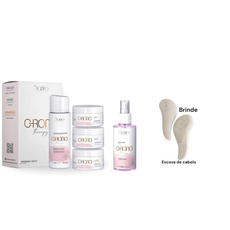 O Cronograma Capilar é uma rotina de cuidados com os cabelos que intercala três tratamentos principais: hidratação, nutrição e reconstrução. Cada etapa do cronograma capilar oferece uma solução especifica para cabelos danificados por fatores como poluição, incidência de raios solares, cloro da água, uso excessivo de ferramentas de calor, procedimentos quimicos de coloração ou descoloração, entre outros. Produto Vegano Sem Parabenos Sem Petrolatos e Derivados Modo de usar: com os cabelos molhados, aplicar o shampoo preparatório CHrono Therapy iniciando a massagem pelo couro cabeludo até atingir toda a exttensão dos fios e enxaguar. Repita a operação se necessário.Em seguida aplique a máscara indicada a sua necessidade, distribuindo suavemente com um pente até que perceba que o produto foi totalmente absorvido. Deixe o produto agir por 5 minutos.Pentear e enxaguar os fios.Finalize como desejar usando o òleo reparador de pontas Kit contém: 01 Shampoo preparatório 300ml 01 Máscara de Hidratação 200g 01 Máscara de Nutrição 200g 01 Máscara de Recosntrução 200g 01 Óleo reparador de Pontas de 30ml 01 Escova para Cabelos Elegante e Funcional Hidratação: D' pantenol, Pró- vitamina B5Nutrição: Mix de óleos, Repara os fios, nutre e dá brilho.Reconstrução: Queratina, Devolução de nutrientes essenciais aos fios. Óleo Capilar Chrono Therapy repara intensivamente os cabelos danificados. Sua fórmula contém blend de óleos, que nutre, hidrata e restaura profundamente a saúde dos fios, proporcionando brilho, maciez e redução de frizz. Contém proteção térmica.