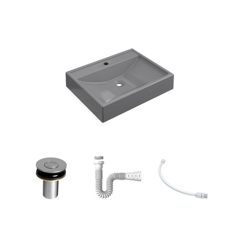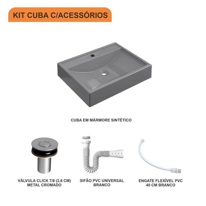 Kit Cuba Rt49 C/válvula Click 1''b (2,6cm) + Sifão Pvc + Flexível Cinza CinzaSobre o ProdutoKit Cuba RT49 C/Válvula Click 1''B (2,6cm) + Sifão Pvc + Flexível AmareloDescrição do ProdutoO Kit KTCART490W.AM.AP02 é uma combinação perfeita da Cuba de Apoio CART490W.AM com acessórios complementares, prontos para instalação no seu lavabo ou móvel de banheiro. Ele conta com 1 Cuba de Apoio Retangular RT49 50,5X40cm Amarelo + 1 Válvula P/Lavatório Click Up Interno 1 (2,6cm) V02 Metal Cromado + 1 Sifão Pvc Universal Branco + 1 Engate Flexível Pvc Branco 40cm + 0+ 0 , todos compatíveis e prontos para instalação.Itens Inclusos:1 Cuba de Apoio + 1 Válvula de Escoamento Clik Up + 1 Sifão PVC Universal Branco + 1 Engate Flexível 40cm Informações Logísticas:Vol.01 - Comp.: 61cm - Prof.: 43cm - Alt.: 17cm - Peso Bruto: 7,56Kg Observações:Não acompanha acessórios decorativos. Imagens meramente ilustrativas.Informações Técnicas / CaracterísticasCuba de Apoio Retangular RT49 50,5X40cm Amarelo- Cor: Amarelo- Marca: Compace- Modelo: CART490- Linha: Plus- Formato: Retangular- Tipo de Cuba: Apoio- Material: Mármore Sintético- Acabamento: Hard Lacca PU- Escala de Brilho: Brilho- Possui Ladrão: Não- Possui Furação para Torneira: Sim- Diâmetro do Furo para Torneira: (32mm) - DN 32- Diâmetro do Furo para Válvula: (32mm) - DN 32 - Comprimento: 50,5cm- Largura: 40cm- Altura: 10,5cm - Peso Líq.: 6,4Kg- Recomendações de Uso, Manutenção e Limpeza: Utilize flanela seca ou pano macio, levemente umedecido com água. Evite contato com produtos químicos e abrasivos (solventes, thinner, acetona etc) e não utilize nenhum tipo de esponja de aço. Para maior brilho, recomendamos a utilização de cera automotiva n° 2.- Necessita de Montagem: Sim / Acompanha Manual de Montagem- Complexidade da Montagem: Média: pode ser montado por mais de uma pessoa e/ou necessite de maior conhecimento para montagem.- Garantia: 6 mesesVálvula P/Lavatório Click Up Interno 1 (2,6cm) V02 Metal Cromado- Cor: Cromado- Marca: Compace- Modelo: CO1612V02- Linha: Complementos- Tipo: Click- Local: Lavatório- Acabamento: Cromado- Material: Zamak, Elastômeros e Plásticos de Engenharia.- Bitola do Cano: 1- Possui Ladrão: Não - Altura: 7cm- Diâmetro: 5,5cm - Altura Total: 8cm- Peso Líq.: 0,14Kg- Recomendações de Uso, Manutenção e Limpeza: Limpar apenas com pano macio e sabão neutro. Não usar produtos abrasivos como sapólio, palha de aço e produtos químicos.- Necessita de Montagem: Sim- Complexidade da Montagem: Média: pode ser montado por mais de uma pessoa e/ou necessite de maior conhecimento para montagem.- Garantia: 5 anosSifão Pvc Universal Branco- Cor: Branco- Marca: Compace- Modelo: SPVC- Linha: Complementos- Tipo: Flexível- Local: Multiuso- Acabamento: PVC- Material: PVC- Bitola do Cano: Universal - Temperatura da Água Indicada: Mín.: 0° Celsius / Máx.: 90° Celsius - Comprimento: 29cm - Diâmetro: 5cm- Comprimento Total: 71cm - Peso Líq.: 0,1Kg- Recomendações de Uso, Manutenção e Limpeza: Limpar apenas com pano macio e sabão neutro. Não usar produtos abrasivos como sapólio, palha de aço e produtos químicos.- Necessita de Montagem: Sim- Complexidade da Montagem: Média: pode ser montado por mais de uma pessoa e/ou necessite de maior conhecimento para montagem.- Garantia: 01 anoEngate Flexível Pvc Branco 40cm- Cor: Branco- Marca: Compace- Modelo: FLEX- Linha: Complementos- Tipo: Flexível- Local: Multiuso- Acabamento: PVC- Material: PVC- Bitola do Cano: Universal - Pressão Indicada: 40 m.c.a.- Temperatura da Água Indicada: Fria - Comprimento: 40cm - Diâmetro: 2cm - Peso Líq.: 0,08Kg- Recomendações de Uso, Manutenção e Limpeza: Limpar apenas com pano macio e sabão neutro. Não usar produtos abrasivos como sapólio, palha de aço e produtos químicos.- Necessita de Montagem: Sim- Complexidade da Montagem: Média: pode ser montado por mais de uma pessoa e/ou necessite de maior conhecimento para montagem.- Garantia: 01 ano Formato: Retangular | Tipo de Cuba: Apoio | Material: Mármore Sintético | Acabamento: Hard Lacca PU Fosco | Escala de Brilho: Fosco | Possui Furação para Torneira: Sim | Diâmetro do Furo para Torneira: (32mm) - DN 32 | Diâmetro do Furo para Válvula: (32mm) - DN 32 | Itens Inclusos: 1 Cuba de Apoio + 1 Válvula de Escoamento Clik Up + 1 Sifão PVC Universal Branco + 1 Engate Flexível 40cm | Limite de unidades por venda: É possível comprar até 1 unidade por venda. | Quantidade máxima de pedido: 1 | Baterias são necessárias?: false Cor: Cinza