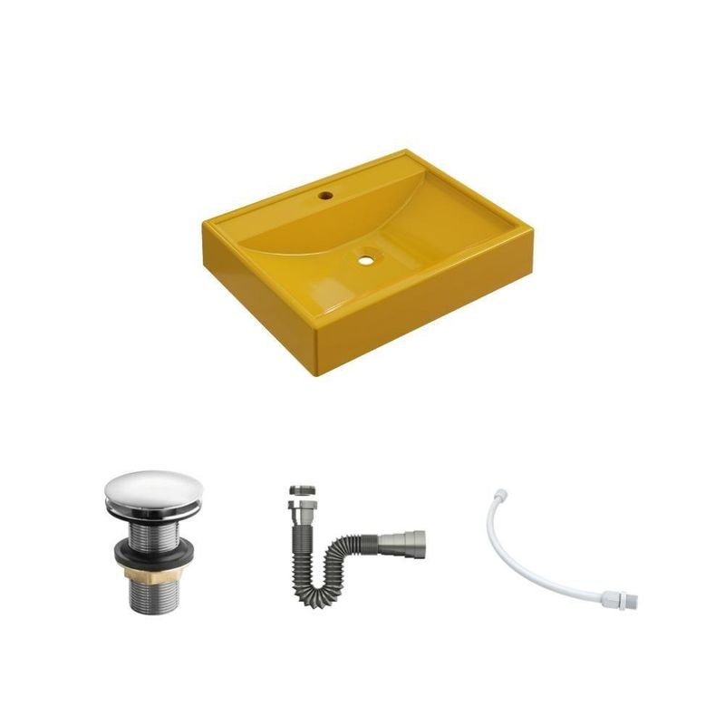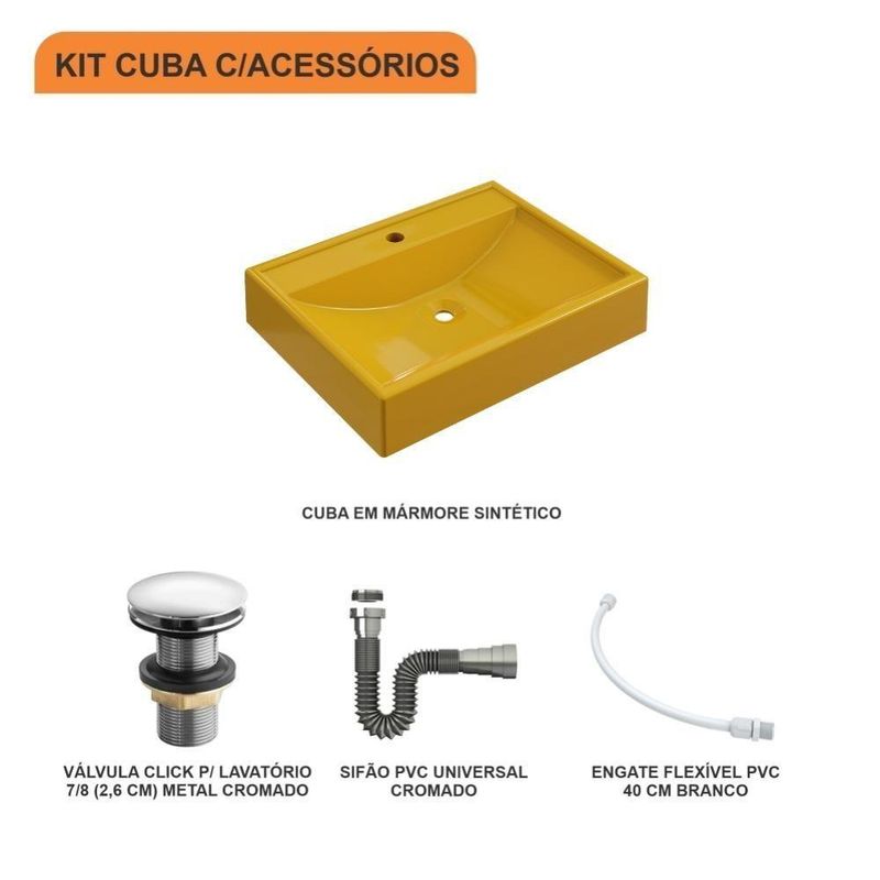 Kit Cuba Rt49 C/válvula Click 1''g + Sifão Cromado + Flexível Amarelo AmareloSobre o ProdutoKit Cuba RT49 C/Válvula Click 1''G + Sifão Cromado + Flexível AmareloDescrição do ProdutoO Kit KTCART490W.AM.AC03 é uma combinação perfeita da Cuba de Apoio CART490W.AM com acessórios complementares, prontos para instalação no seu lavabo ou móvel de banheiro. Ele conta com 1 Cuba de Apoio Retangular RT49 50,5X40cm Amarelo + 1 Válvula P/Lavatório Click Up 1 (2,6cm) V03 Metal Cromado + 1 Sifão Pvc Universal Cromado + 1 Engate Flexível Pvc Branco 40cm + 0+ 0 , todos compatíveis e prontos para instalação.Itens Inclusos:1 Cuba de Apoio + 1 Válvula de Escoamento Clik Up + 1 Sifão PVC Universal Cromado + 1 Engate Flexível 40cm Informações Logísticas:Vol.01 - Comp.: 61cm - Prof.: 43cm - Alt.: 17cm - Peso Bruto: 7,6Kg Observações:Não acompanha acessórios decorativos. Imagens meramente ilustrativas.Informações Técnicas / CaracterísticasCuba de Apoio Retangular RT49 50,5X40cm Amarelo- Cor: Amarelo- Marca: Compace- Modelo: CART490- Linha: Plus- Formato: Retangular- Tipo de Cuba: Apoio- Material: Mármore Sintético- Acabamento: Hard Lacca PU- Escala de Brilho: Brilho- Possui Ladrão: Não- Possui Furação para Torneira: Sim- Diâmetro do Furo para Torneira: (32mm) - DN 32- Diâmetro do Furo para Válvula: (32mm) - DN 32 - Comprimento: 50,5cm- Largura: 40cm- Altura: 10,5cm - Peso Líq.: 6,4Kg- Recomendações de Uso, Manutenção e Limpeza: Utilize flanela seca ou pano macio, levemente umedecido com água. Evite contato com produtos químicos e abrasivos (solventes, thinner, acetona etc) e não utilize nenhum tipo de esponja de aço. Para maior brilho, recomendamos a utilização de cera automotiva n° 2.- Necessita de Montagem: Sim / Acompanha Manual de Montagem- Complexidade da Montagem: Média: pode ser montado por mais de uma pessoa e/ou necessite de maior conhecimento para montagem.- Garantia: 6 mesesVálvula P/Lavatório Click Up 1 (2,6cm) V03 Metal Cromado- Cor: Cromado- Marca: Compace- Modelo: CO1613V03- Linha: Complementos- Tipo: Click- Local: Lavatório- Acabamento: Cromado- Material: Zamak, Elastômeros e Plásticos de Engenharia.- Bitola do Cano: 1- Possui Ladrão: Não - Altura: 8cm- Diâmetro: 5,7cm - Altura Total: 9cm- Peso Líq.: 0,18Kg- Recomendações de Uso, Manutenção e Limpeza: Limpar apenas com pano macio e sabão neutro. Não usar produtos abrasivos como sapólio, palha de aço e produtos químicos.- Necessita de Montagem: Sim- Complexidade da Montagem: Média: pode ser montado por mais de uma pessoa e/ou necessite de maior conhecimento para montagem.- Garantia: 5 anosSifão Pvc Universal Cromado- Cor: Cromado- Marca: Compace- Modelo: SCRO- Linha: Complementos- Tipo: Flexível- Local: Multiuso- Acabamento: Cromado- Material: PVC- Bitola do Cano: Universal - Temperatura da Água Indicada: Mín.: 0° Celsius / Máx.: 90° Celsius - Comprimento: 29cm - Diâmetro: 5cm- Comprimento Total: 71cm - Peso Líq.: 0,1Kg- Recomendações de Uso, Manutenção e Limpeza: Limpar apenas com pano macio e sabão neutro. Não usar produtos abrasivos como sapólio, palha de aço e produtos químicos.- Necessita de Montagem: Sim- Complexidade da Montagem: Média: pode ser montado por mais de uma pessoa e/ou necessite de maior conhecimento para montagem.- Garantia: 01 anoEngate Flexível Pvc Branco 40cm- Cor: Branco- Marca: Compace- Modelo: FLEX- Linha: Complementos- Tipo: Flexível- Local: Multiuso- Acabamento: PVC- Material: PVC- Bitola do Cano: Universal - Pressão Indicada: 40 m.c.a.- Temperatura da Água Indicada: Fria - Comprimento: 40cm - Diâmetro: 2cm - Peso Líq.: 0,08Kg- Recomendações de Uso, Manutenção e Limpeza: Limpar apenas com pano macio e sabão neutro. Não usar produtos abrasivos como sapólio, palha de aço e produtos químicos.- Necessita de Montagem: Sim- Complexidade da Montagem: Média: pode ser montado por mais de uma pessoa e/ou necessite de maior conhecimento para montagem.- Garantia: 01 ano Formato: Retangular | Tipo de Cuba: Apoio | Material: Mármore Sintético | Acabamento: Hard Lacca PU Fosco | Escala de Brilho: Fosco | Possui Furação para Torneira: Sim | Diâmetro do Furo para Torneira: (32mm) - DN 32 | Diâmetro do Furo para Válvula: (32mm) - DN 32 | Itens Inclusos: 1 Cuba de Apoio + 1 Válvula de Escoamento Clik Up + 1 Sifão PVC Universal Cromado + 1 Engate Flexível 40cm | Limite de unidades por venda: É possível comprar até 1 unidade por venda. | Quantidade máxima de pedido: 1 | Baterias são necessárias?: false Cor: Amarelo