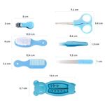 Kit Cuidados Higiene Bebe Pente Escova Cortador De Unha Recém Nascidos Cor:azulKit Cuidados Higiene Bebê Pente Escova Cortador De Unha Recém Nascido 7 PeçasO Kit Cuidados Higiene Para Bebê foi especialmente desenvolvido para os pais cuidarem com delicadeza, segurança e conforto dos seus pequeninos. Este kit contém a maioria dos itens essenciais que você precisa para manter seu bebê bem. Ele contém tesouras de segurança, escova de cabelo, pente e corta unhas, termômetro de banheira, pinça, etc.- Tesoura com ponta arredondada e capa protetora- Cortador de unha Arredondado- Escova com cerdas macias- Pente com pontas arredondadas- Esse produto não é um brinquedo- Pinça de Plástico- Termômetro De BanheiroEspecificações Técnicas:Modelo: Kit Cuidados Higiene BebêCor: Azul.Material: Plástico BPA Free e Aço InoxDimensões da Embalagem Aprox.: 22,2 cm X 18,2 cm X 2,8 cmPeso Aprox.: 150 gItens Inclusos na Embalagem:- 01x Tesoura Ponta Redonda- 01x Escova Cerda Macia- 01x Pente Ponta Arredondada- 01x Termômetro De Banheira- 01x Cortador de Unha- 01x Pinça- 01x Lixa