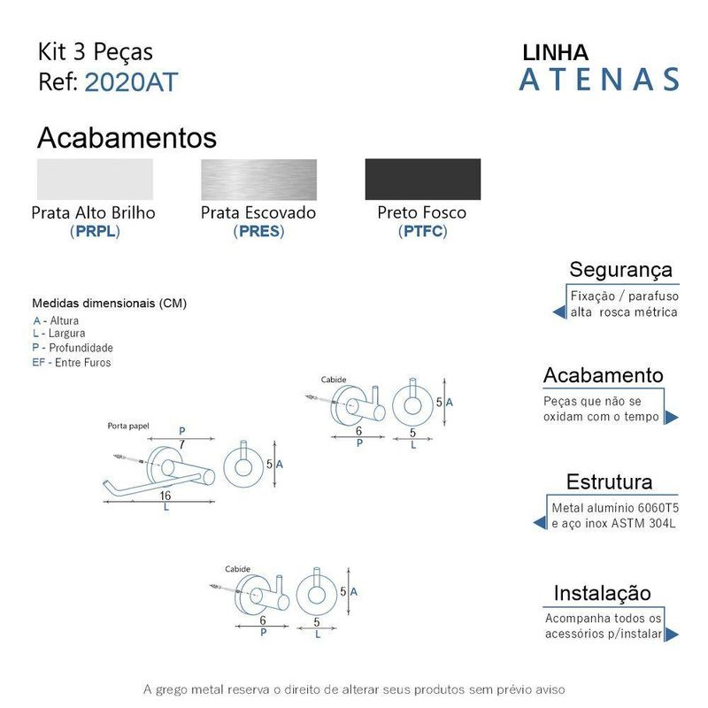 Kit De Acessórios Para Banheiro Alto Brilho 3 Peças Grego Metal 2020atO kit acessórios de banheiro da linha Atenas possui um design retrô, são peças que se destacam com luxo e elegãncia. ;Além de decorar, organiza com funcionalidade o banheiro. Criado em metais nobres com uma qualidade que abrange áreas litorâneas e possui a garantia de um acabamento muito resistente. ;Agora é só você adquirir estes lindos acessórios e fazer o seu projeto se tornar realidade com um banheiro prático para toda a sua família.CARACTERÍSTICAS ;• Fabricado em metal aço inox e alumínio.• Disponível no Prata Alto Brilho, Escovado e Preto Fosco.• Pode ser instalado em parede, azulejo e porcelanato.BENEFÍCIOS• Fixação prática e segura com parafusos e buchas inclusos.• O produto não possui nenhum detalhe em plástico (ABS).• Fácil higienização, ideal para locais que exigem limpeza constante.• Aproveitamento inteligente do espaço, ideal para ambientes compactos.• Resistente à corrosão e luz solar.ITENS ENVIADOS: 2 cabides, 1 porta papel higiênico, kit de parafusos e manual instrução instalação.INSTALAÇÃO INTELIGENTEAo 1º furo, use uma broca medida menor, após use a medida correta e finalize, vai ajudar na precisão da fixação da bucha principalmente em azulejos e porcelanato.
