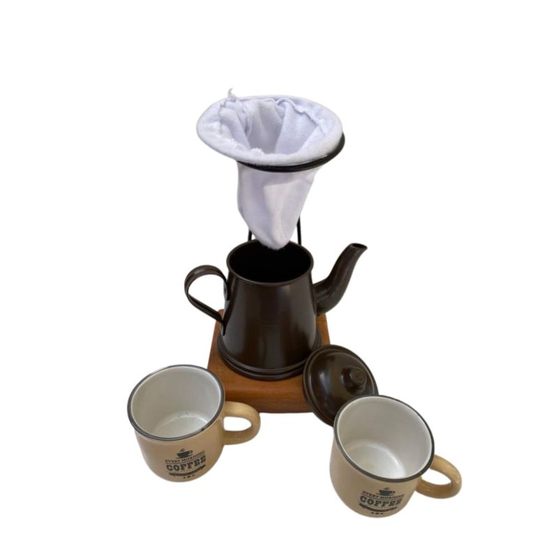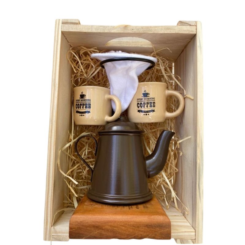 Um belo presente para quem gosta de café coado e quer bebe-lo quando tiver vontade. Esse kit é composto pela base madeira de demolição, coador de pano, 2 (duas) canequinhas de ceramica e um bule, caixa de madeira para presente. Canequinha de ceramica altura - 5,8cm diâmetro - 6cm Mini Bule altura : 9,5cm , diâmetro base: 8cm, largura total: 16cm Coador: Base madeira de demolição: 10cm x 10cm x 2cm Altura total: 22cm diâmetro base coador 8,5cm Caixa modelo engradado