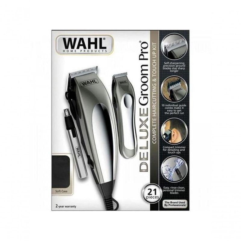 Kit De Máquina De Corte E Aparador Wahl Deluxe Groom Pro 220vO Kit de Máquina de Corte e Aparador Wahl Deluxe Groom Pro é a escolha definitiva para cuidados pessoais masculinos. Inclui máquina de corte e aparador com lâminas autoafiáveis, alavanca ajustável para diversos tamanhos de corte, e lâminas de aço com alto teor de carbono para cortes suaves e precisos. Além disso, acompanha um aparador para nariz e orelhas, garantindo um cuidado completo e impecável. Voltagem:220V Cabo:2,4 m Pesquisa:kit|aparador|maquina|corte|cabelo|dlx|deluxe|groom|pro|220v|220|prata| - Alimentação: Operação contínua / Pilha Acessórios: - Máquina de corte - Aparador de pelos para rosto e corpo - Aparador de pelos para nariz e orelhas - 8 pentes graduadores (#1, #2, #3, #4, #5, #6, #7 e #8) - Pentes graduadores para orelha esquerda e direita - Pente para pentear - Tesoura - Estojo de armazenamento - Óleo de lubrificação de lâmina - Pincel de limpeza - Protetor de lâminaO Kit de Máquina de Corte e Aparador Wahl Deluxe Groom Pro é a escolha definitiva para cuidados pessoais masculinos. Inclui máquina de corte e aparador com lâminas autoafiáveis, alavanca ajustável para diversos tamanhos de corte, e lâminas de aço com alto teor de carbono para cortes suaves e precisos. Além disso, acompanha um aparador para nariz e orelhas, garantindo um cuidado completo e impecável. Voltagem:220V Cabo:2,4 m Pesquisa:kit|aparador|maquina|corte|cabelo|dlx|deluxe|groom|pro|220v|220|prata| - Alimentação: Operação contínua / Pilha Acessórios: - Máquina de corte - Aparador de pelos para rosto e corpo - Aparador de pelos para nariz e orelhas - 8 pentes graduadores (#1, #2, #3, #4, #5, #6, #7 e #8) - Pentes graduadores para orelha esquerda e direita - Pente para pentear - Tesoura - Estojo de armazenamento - Óleo de lubrificação de lâmina - Pincel de limpeza - Protetor de lâmina