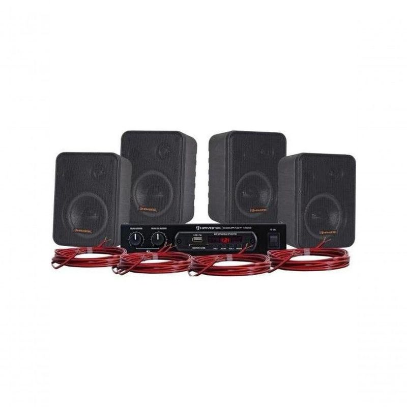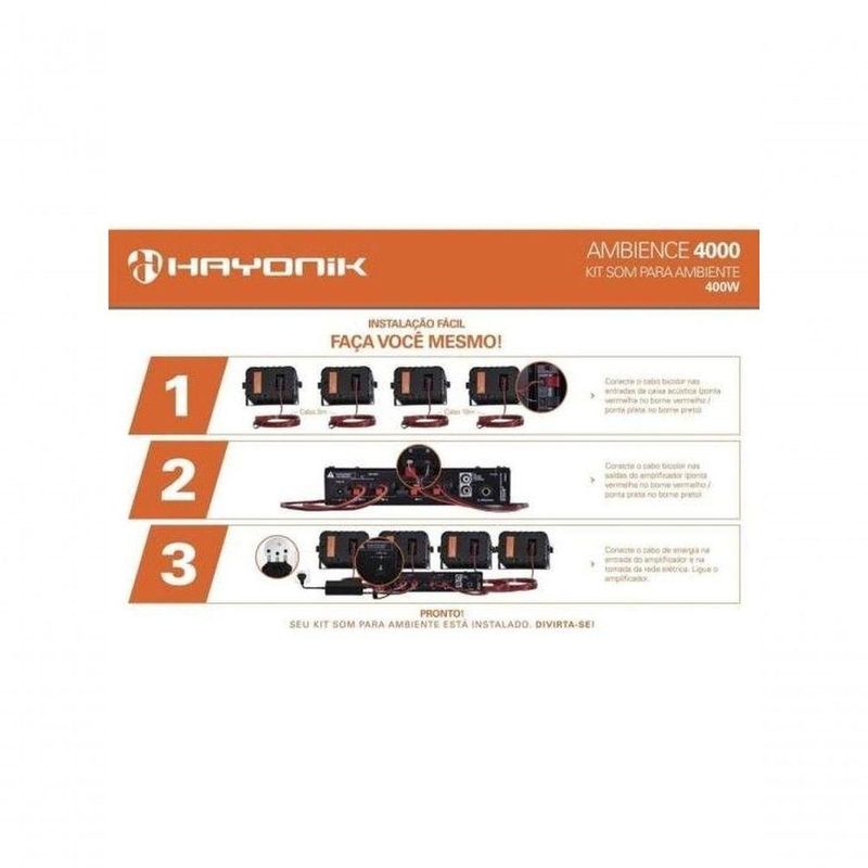 Kit De Som Para Ambiente Hayonik Ambience 4000 V2 PretoO Kit de Som Para Ambiente Hayonik Ambience 4000 V2 proporciona som ideal para todos os ambientes! O Ambience 4000 V2 possibilita sonorizar seu ambiente de forma prática e com grande facilidade. Composto por 1 amplificador COMPACT 400, 4 caixas acústicas MSB60NC, 2 cabos bicolor de 5m cada e 2 cabos bicolor de 10m cada, sua instalação é simples, prática e rápida. Além da incrível qualidade de som, com 400W de potência musical, o kit ainda conta com uma ampla compatibilidade. Reproduz arquivos através da entrada USB, SD/MMC, via Rádio FM e ainda possui Bluetooth para compartilhar suas músicas favoritas diretamente do seu smartphone em diversas áreas como churrasqueiras, áreas gourmet, salões de festas, escritórios, salas de convenção e academias. Instalação Fácil. Faça Você Mesmo! Muito fácil de ser montado, este kit conta com 3 passos para a instalação, assim evitando precisar contratar um técnico para montagem. Os passos são: 1. Conecte o cabo bicolor nas entradas da caixa acústica (ponta vermelha no borne vermelho / ponta preta no borne preto). 2. Conecte o cabo bicolor nas saídas do amplificador (ponta vermelha no borne vermelho / ponta preta no borne preto). 3. Conecte o cabo de energia na entrada do amplificador e na tomada da rede elétrica. Pronto! Basta ligar o amplificador e desfrutar de suas músicas favoritas. Alimentação:Bivolt Potência:Amplificador: 40W RMS / Caixa: 30W RMS (Cada) Impedância:Amplificador: 8 Ohms / Caixa: 8 Ohms (Cada) Entradas:Amplificador: USB, Cartão SD/MMC, 2x RCA e Microfone (P10) Saídas:Até 4 caixas Pesquisa:kit|ambiente|400|w|ambience4000|ambience-4000|ambience 4000 v2|O Kit de Som Para Ambiente Hayonik Ambience 4000 V2 proporciona som ideal para todos os ambientes! O Ambience 4000 V2 possibilita sonorizar seu ambiente de forma prática e com grande facilidade. Composto por 1 amplificador COMPACT 400, 4 caixas acústicas MSB60NC, 2 cabos bicolor de 5m cada e 2 cabos bicolor de 10m cada, sua instalação é simples, prática e rápida. Além da incrível qualidade de som, com 400W de potência musical, o kit ainda conta com uma ampla compatibilidade. Reproduz arquivos através da entrada USB, SD/MMC, via Rádio FM e ainda possui Bluetooth para compartilhar suas músicas favoritas diretamente do seu smartphone em diversas áreas como churrasqueiras, áreas gourmet, salões de festas, escritórios, salas de convenção e academias. Instalação Fácil. Faça Você Mesmo! Muito fácil de ser montado, este kit conta com 3 passos para a instalação, assim evitando precisar contratar um técnico para montagem. Os passos são: 1. Conecte o cabo bicolor nas entradas da caixa acústica (ponta vermelha no borne vermelho / ponta preta no borne preto). 2. Conecte o cabo bicolor nas saídas do amplificador (ponta vermelha no borne vermelho / ponta preta no borne preto). 3. Conecte o cabo de energia na entrada do amplificador e na tomada da rede elétrica. Pronto! Basta ligar o amplificador e desfrutar de suas músicas favoritas. Alimentação:Bivolt Potência:Amplificador: 40W RMS / Caixa: 30W RMS (Cada) Impedância:Amplificador: 8 Ohms / Caixa: 8 Ohms (Cada) Entradas:Amplificador: USB, Cartão SD/MMC, 2x RCA e Microfone (P10) Saídas:Até 4 caixas Pesquisa:kit|ambiente|400|w|ambience4000|ambience-4000|ambience 4000 v2|