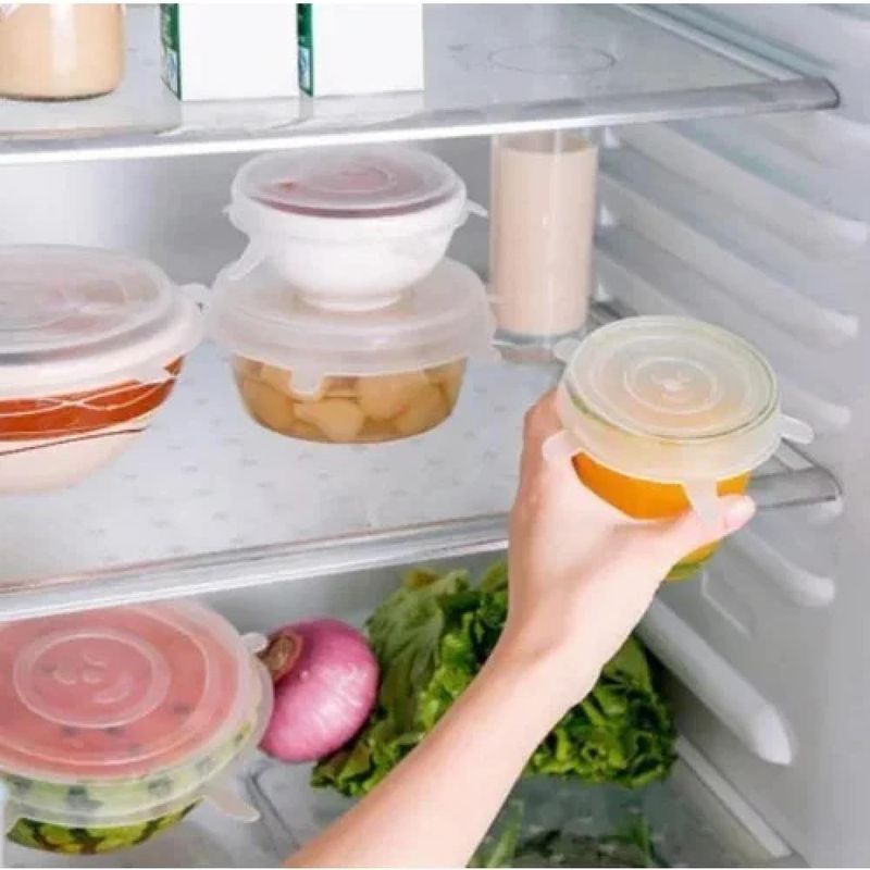 Kit De Tampas De Silicone Reutilizáveis Vedação Hermética Perfeito Para Conservar Alimentos Kit de Tampas de Silicone Reutilizáveis – vedação hermética e ajuste perfeito para conservar alimentos com mais praticidadeO Kit com 6 Tampas de Silicone Reutilizáveis é a solução ideal para armazenar alimentos com segurança, organização e durabilidade. Feitas em silicone flexível, elas se ajustam facilmente a recipientes de vários formatos — tigelas, panelas, xícaras, copos, potes, latas e até frutas cortadas — garantindo uma vedação hermética que mantém o frescor por muito mais tempo.Resistentes a altas e baixas temperaturas, são perfeitas para geladeira, freezer e micro-ondas. Além disso, substituem o plástico filme descartável, trazendo mais economia e sustentabilidade para sua rotina.Benefícios do ProdutoVedação hermética: conserva alimentos por mais tempo e evita odores na geladeiraReutilizável e lavável: muito mais economia e sustentabilidadeSilicone flexível que se adapta a diferentes formatos e tamanhosResistente a altas e baixas temperaturasMaterial seguro, atóxico e BPA FreeMantém a geladeira organizada e sem vazamentosEspecificações TécnicasMaterial: Silicone de alta qualidadeTamanhos das tampas:- 20 × 3,5 cm- 17 × 3 cm- 14 × 2,8 cm- 12 × 2,8 cm- 10 × 2,5 cm- 6 × 2,2 cmConteúdo da Embalagem1 Kit com 6 tampas de silicone reutilizáveisUma maneira prática, ecológica e eficiente de armazenar alimentos e organizar sua cozinha!