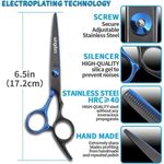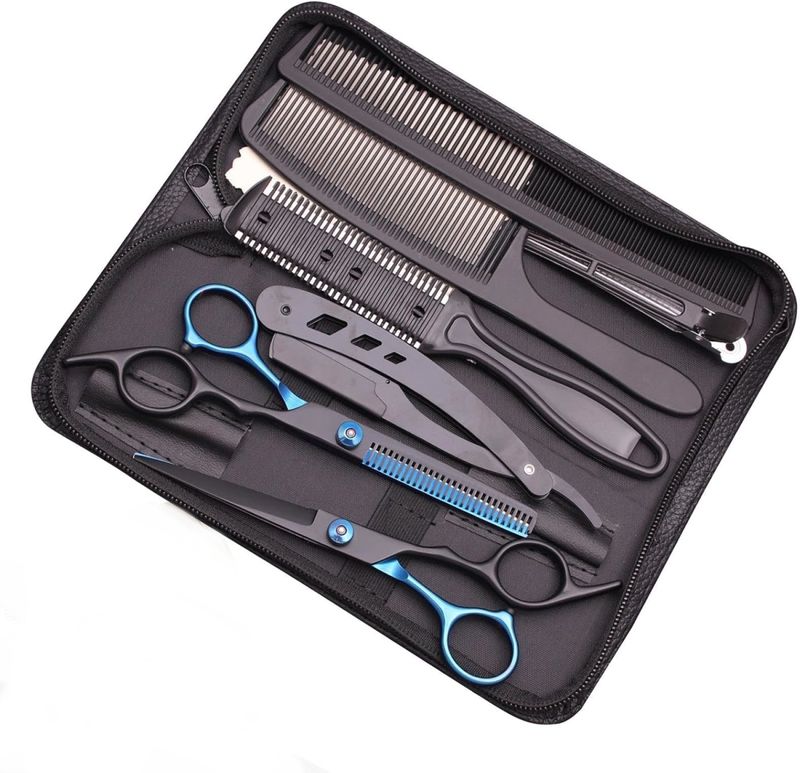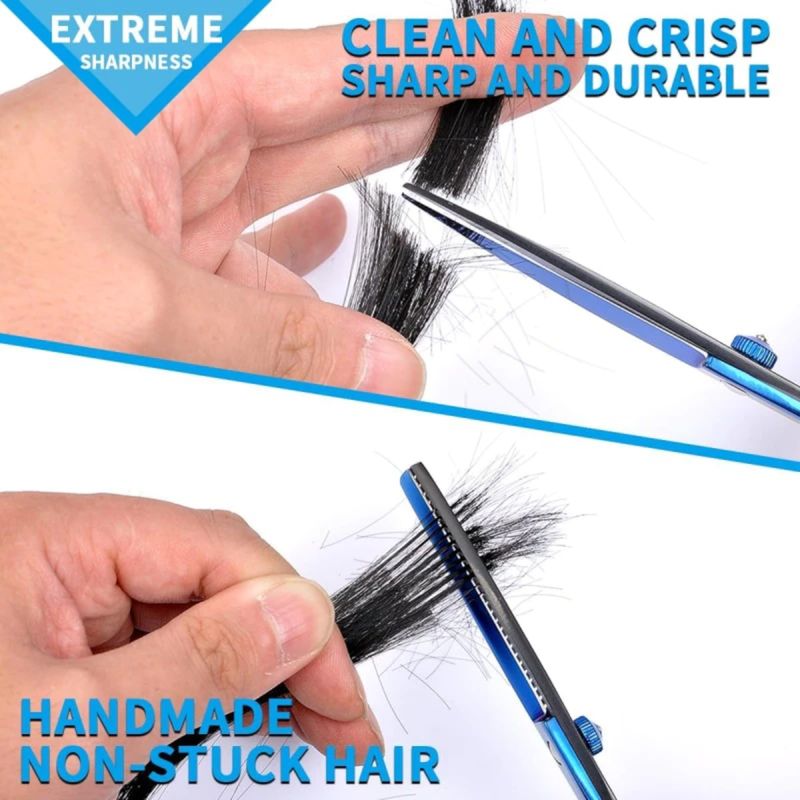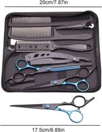 Material da lâmina: aço inoxidável com dureza HRC ?40 (conforme imagem).Comprimento total das tesouras: 17,2 cm (6,5 polegadas) - tamanho padrão para corte.Design ambidestro, com apoio para os dedos e alça ergonômica.Kit contém 6 peças: 2 tesouras retas, 1 tesoura dentada, 2 pentes e 1 afiador.Não inclui estojo, mas acompanha bolsa de transporte em tecido resistente (imagem).Peso total do kit: 300 g; peso por peça não informado.Sem parafuso ajustável - fixação da lâmina é permanente.Este kit de tesouras para corte de cabelo é projetado para uso profissional e doméstico, oferecendo ferramentas essenciais para cortes precisos e camadas. Fabricado em aço inoxidável, garante durabilidade e resistência à corrosão. Ideal para cabeleireiros iniciantes, amadores e profissionais que buscam qualidade em casa ou no salão.Construção e Materiais:Materiais de alta qualidade e durabilidade, garantindo resistência ao uso diário e longa vida útil.Componentes sustentáveis e recicláveis, alinhados às práticas ambientais modernas.Acabamentos com proteção contra corrosão, manchas e desgaste típico de uso em ambientes úmidos.Estrutura em aço inoxidável, leve e resistente, ideal para manuseio prolongado.Materiais leves que facilitam o manuseio sem comprometer a robustez.Design e Estética:Design funcional com acabamento preto fosco e detalhes em azul metálico nas alças.Formato ergonômico com apoio para os dedos, proporcionando conforto durante o corte.Lâminas retas e dentadas para diferentes técnicas de corte e texturização.Integração harmoniosa entre as peças do kit, com organização interna na bolsa de transporte.Instalação e Versatilidade:Produto pronto para uso imediato após retirada da embalagem.Versatilidade para múltiplas aplicações: cortes lineares, camadas, desbaste e acabamento.Compatível com uso em salões, barbearias e ambiente doméstico.Bolsa de transporte em tecido resistente permite armazenamento seguro e portabilidade.Cuidados e Manutenção:Limpeza fácil com pano seco ou umedecido após cada uso.Resistência a manchas e desgaste comum em ambientes de corte.Recomenda-se evitar exposição prolongada à umidade excessiva.Garantia e suporte técnico conforme política do vendedor.Embalagem e Transporte:Embalagem reforçada com materiais de alta resistência, garantindo proteção contra impactos.Utilização de materiais recicláveis na embalagem.Dimensões da embalagem otimizadas para transporte seguro.Etiquetagem clara com código de barras e identificação do produto.Embalagem projetada para atender normas básicas de acondicionamento.ESPECIFICAÇÕES TÉCNICASNome do produto: Kit de Tesouras para Corte de CabeloCategoria: Ferramentas de Cabeleireiro / Acessórios para SalãoMaterial principal: Aço inoxidávelAcabamento: Preto fosco com detalhes azuisDimensões (A x L x P): 17,2 cm (comprimento das tesouras)Peso: 300 g (kit completo)Cores disponíveis: Preto e azulItens inclusos: 2 tesouras retas, 1 tesoura dentada, 2 pentes, 1 afiador, 1 bolsa de transporteMétodo de instalação: Pronto para usoCompatibilidade: Uso manual em cabelos humanos e animaisUso recomendado: Interno, salão, barbearia, uso doméstico.