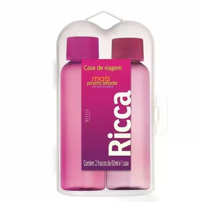 Kit De Viagem Case Com Dois Frascos Colors Ricca Cod. 3320 Desenvolvido especialmente para viagens, o Kit de Viagem Case Ricca possui dois frascos e um embalagem perfeita para manter a organização em sua mala sem ocupar muito espaço. Ideal para viagens ou até mesmo carregar em bolsas de academia, ou saídas rápidas. Características: Kit de viagem contém 1 case e 2 frascos de 60ml para shampoo, condicionador e cremes capilares. Diferencial: Ideal para bagagem de bordo