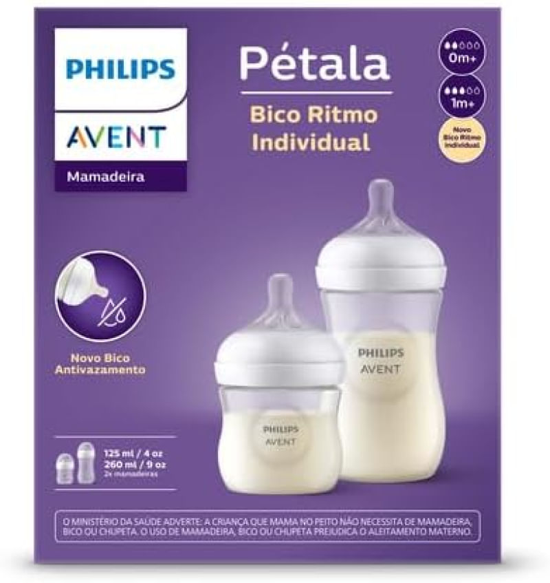 Kit Duplo Mamadeira Pétala Transparente 125ml + 260ml - Avent A infância é a etapa dos primeiros aprendizados na vida. Por meio dela, a criança descobre e coloca em prática o amor pelos pais e, para que você também retribua da melhor maneira, a Philips Avent traz as Mamadeiras Pétalas Philips Avent 125ml e 260ml. As Mamadeiras são feitas em polipropileno, um material leve resistente, apresentam um design inovador, têm gargalo largo e quando o assunto é limpeza, você conclui essa tarefa com facilidade. Bico flexível e macio feito em silicone isento de odor e sabor, oferece uma amamentação mais confortável e facilita a pega correta do bebê. Formato ondulado, permite ao bebê segurar facilemente em qualquer direção. Apenas 4 peças para uma montagem simples, rápida e de fácil limpeza. Capacidade (ml): 125ml e 260ml Indicação: 0 a 1 mês e 1 a 3 meses Quantidade:2 Mamadeiras de 125ml e 260ml 40.6mm Material:Polipropileno e Silicone Livre de BPA Certificação Inmetro: REGISTRO: OCP 0040 IMAGENS ILUSTRATIVAS
