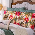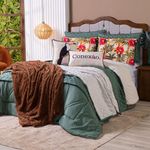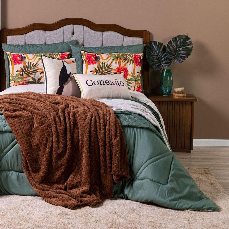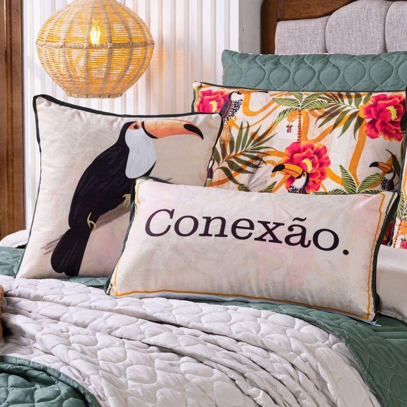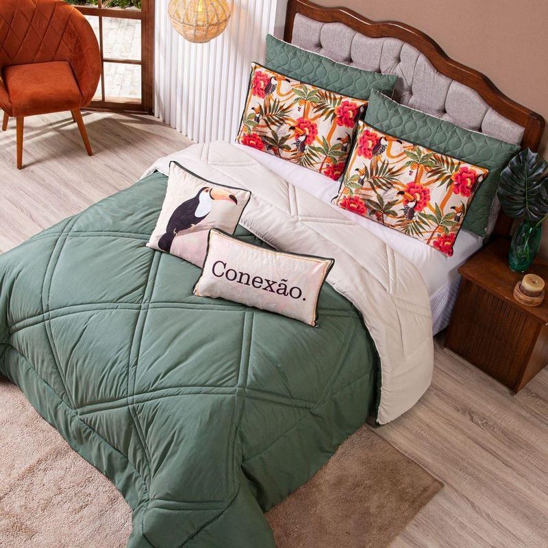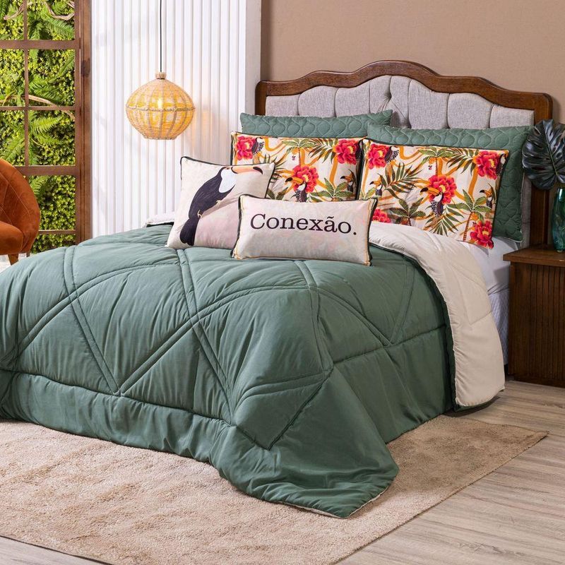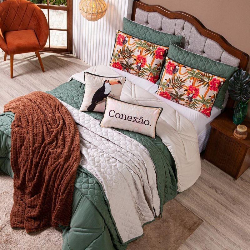 Kit Edredom Casal Padrão Verano Com Almofadas Estampadas 07 Peças - Dupla Face Percal 300 Fios Cor Tucano O Kit Verano é a escolha ideal para quem deseja transformar o quarto em um espaço cheio de vida e aconchego. Inspirado na beleza da natureza, ele traz estampas vibrantes que remetem à floresta, com animais, flores e plantas em cores intensas que deixam o ambiente mais alegre e acolhedor. Produzido em percal poliéster de 300 fios, o tecido oferece um toque super macio e agradável, enquanto o enchimento alto e volumoso garante noites de sono mais confortáveis. O edredom é dupla face e conta com acabamento pantográfico computadorizado, que valoriza ainda mais o design e confere um detalhe sofisticado à peça. Para completar, o kit acompanha fronhas lisas e estampadas, além de almofadas temáticas que dão um charme e trazem uma mensagem especial à decoração, criando um conjunto prático, elegante e cheio de estilo para o dia a dia.Contém:01 Edredom Casal Padrão Dupla Face 2,50m x 2,40m02 Porta Travesseiros Lisos com Debrum 70cm x 50cm02 Porta Travesseiros Estampados em Veludo 70cm x 50cm com Viés01 Almofada Cheia Retangular Estampada em Veludo 60cm x 40cm01 Capa de Almofada Quadrada Estampada em Veludo 45cm x 45cmComposição Edredom:Tecido Percal 300 Fios: 100% PoliésterEnchimento: 100% poliéster Composição Peças Estampadas: Tecido Veludo Suede: 100% PoliésterInstruções de Uso e Lavagem:Vide etiqueta do produto.Atenção:Foto meramente ilustrativa.Variação das cores podem ocorrer de acordo com o monitor.