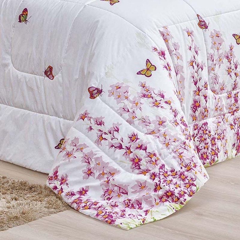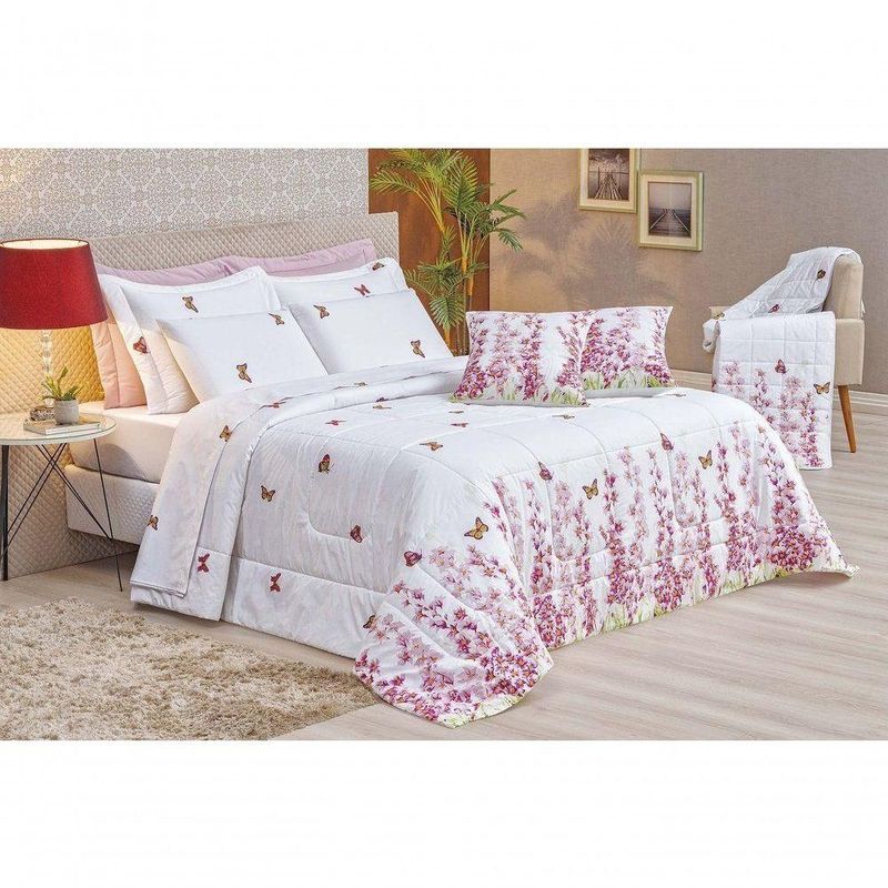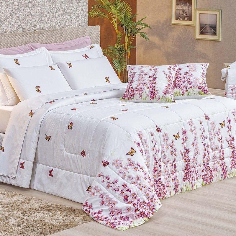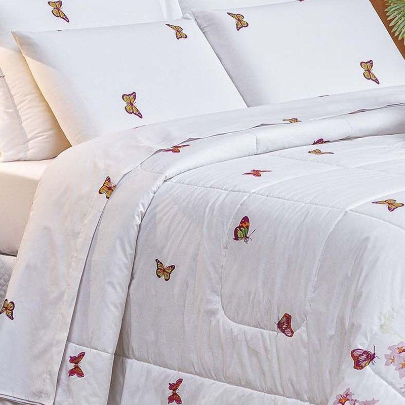 Kit Edredom Craft Casal Padrão Dupla Face 5 Peças Percal 200 Fios 100% Algodão - Estampa BorboletasO Kit Edredom Craft Casal Padrão é a escolha ideal para quem busca o máximo de sofisticação aliada ao conforto superior das fibras naturais. Confeccionado com tecido superior em Percal 200 Fios 100% Algodão, este conjunto oferece um toque extra macio e acetinado, enquanto seu enchimento de manta alta garante o volume e o aconchego característicos de um edredom premium. Com estampas exclusivas e acabamento de alta qualidade, ele transforma o dormitório em um ambiente de puro luxo e bem-estar.Por que escolher este produto?- Qualidade Nobre: Tecido superior em Percal 200 Fios 100% Algodão para um toque de extrema suavidade.- Conforto de Edredom: Enchimento de manta alta que proporciona maior volume e proteção térmica.- Respirabilidade: Base em algodão que permite a ventilação do tecido, ideal para noites de sono revigorantes.Produto composto por (Total 05 Peças):- 01 Edredom Padrão 2,40m x 2,20m- 02 Porta Travesseiros 80cm x 60cm- 02 Refis de Travesseiros 75cm x 55cmEspecificações Técnicas:Edredom:- Tecido Superior (Estampado): Percal 200 FIOS - 100% Algodão- Tecido Inferior (Liso): Percal 120 FIOS - 100% Algodão- Enchimento: 100% PoliésterPorta Travesseiro Estampado:- Tecido: Percal 200 FIOS - 100% AlgodãoRefil Travesseiro:- Tecido: 100% Polipropileno- Enchimento: 100% Poliéster- Estampa: 261 Borboleta