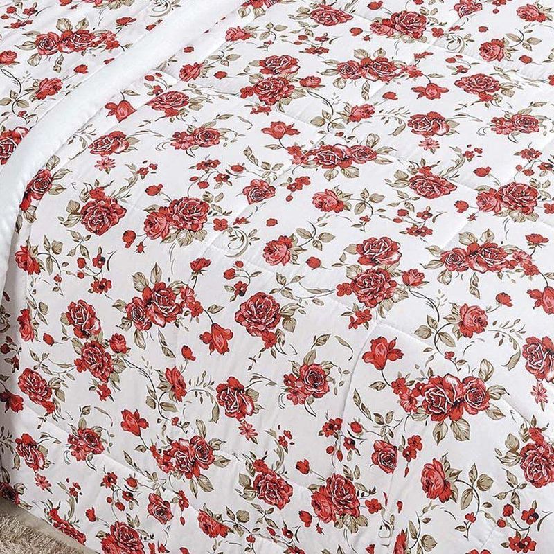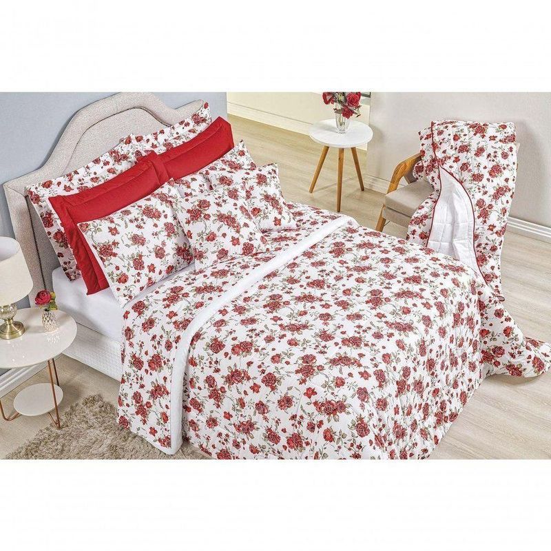 Kit Edredom Craft Casal Padrão Dupla Face 5 Peças Percal 200 Fios 100% Algodão - Estampa Rosas VermelhaO Kit Edredom Craft Casal Padrão é a escolha ideal para quem busca o máximo de sofisticação aliada ao conforto superior das fibras naturais. Confeccionado com tecido superior em Percal 200 Fios 100% Algodão, este conjunto oferece um toque extra macio e acetinado, enquanto seu enchimento de manta alta garante o volume e o aconchego característicos de um edredom premium. Com estampas exclusivas e acabamento de alta qualidade, ele transforma o dormitório em um ambiente de puro luxo e bem-estar.Por que escolher este produto?- Qualidade Nobre: Tecido superior em Percal 200 Fios 100% Algodão para um toque de extrema suavidade.- Conforto de Edredom: Enchimento de manta alta que proporciona maior volume e proteção térmica.- Respirabilidade: Base em algodão que permite a ventilação do tecido, ideal para noites de sono revigorantes.Produto composto por (Total 05 Peças):- 01 Edredom Padrão 2,40m x 2,20m- 02 Porta Travesseiros 80cm x 60cm- 02 Refis de Travesseiros 75cm x 55cmEspecificações Técnicas:Edredom:- Tecido Superior (Estampado): Percal 200 FIOS - 100% Algodão- Tecido Inferior (Liso): Percal 120 FIOS - 100% Algodão- Enchimento: 100% PoliésterPorta Travesseiro Estampado:- Tecido: Percal 200 FIOS - 100% AlgodãoRefil Travesseiro:- Tecido: 100% Polipropileno- Enchimento: 100% Poliéster- Estampa: 15886 Rosas Vermelha