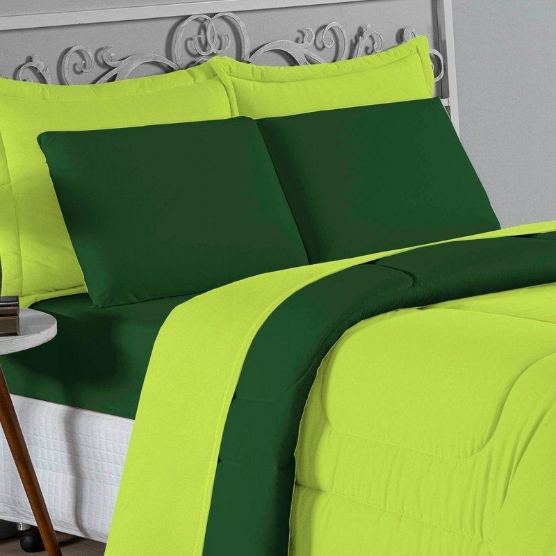 Kit Edredom Dupla Face + Jogo De Lençol Casal Nobre 6 Peças Malha 100% Algodão - Pistache / Verde-bandeiraTransforme seu quarto em um ambiente de descanso luxuoso com o Kit Cama Completa Casal Nobre 6 Peças. A união perfeita entre a praticidade do dia a dia e o conforto superior da malha 100% algodão fio penteado.Por que este Kit é uma ótima escolha?- Toque Extremamente Macio: A confecção em Malha 100% Algodão Fio 30/1 Penteado proporciona uma sensação suave e natural, ideal para quem valoriza o conforto da pele.- Visual Sofisticado: O edredom dupla face e os dois porta travesseiros matelados conferem volume e elegância à cama, dispensando composições difíceis.- Durabilidade Superior: O fio penteado garante um tecido resistente, que mantém a aparência de novo e não forma bolinhas (anti-pilling).- Ajuste Perfeito: O lençol de baixo com elástico abraça colchões de até 30cm de altura, mantendo a cama sempre organizada.Produto composto por (Total 06 Peças):Do Kit Edredom (03 Peças):01 Edredom Casal Dupla Face: 2,00m x 2,20m02 Porta Travesseiros Matelados: 50cm x 70cmDo Jogo de Lençol (03 Peças):01 Lençol de Baixo com Elástico: 1,38m x 1,98m x 30cm02 Fronhas: 70cm x 50cmAtenção: Este kit é composto pelo jogo de cama essencial (lençol com elástico e fronhas) e não inclui o lençol de cima (sobre lençol).Composição:Tecido (Todas as peças): Malha 100% Algodão - Fio 30/1 PenteadoEnchimento (Edredom e Porta Travesseiros): 100% Poliéster (Edredom com fibra siliconada)Forro (Apenas Porta Travesseiros): 100% Polipropileno