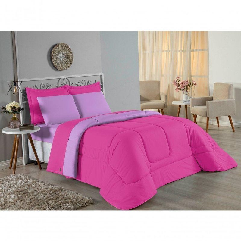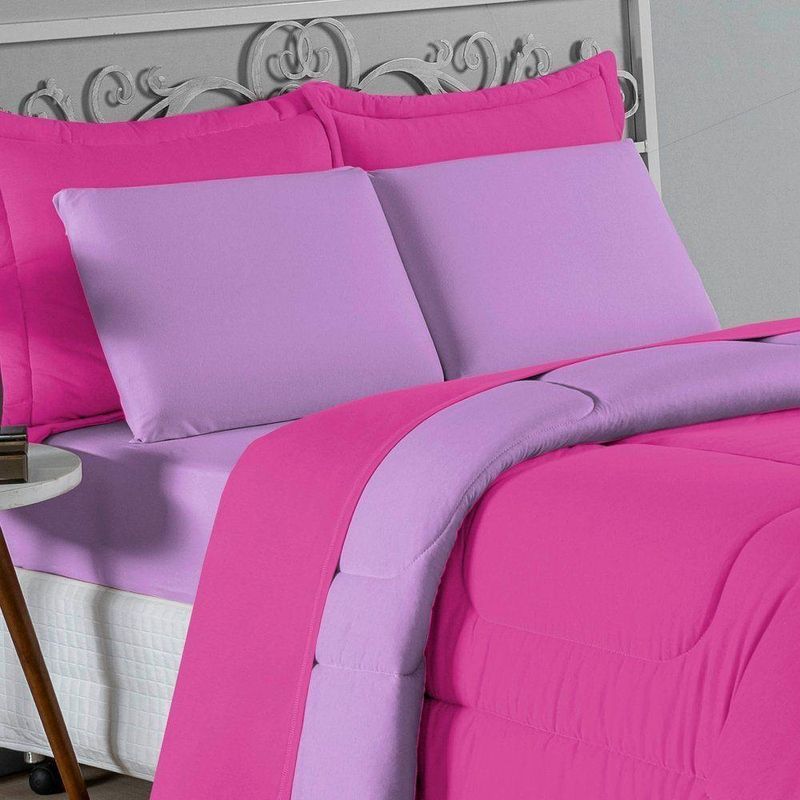 Kit Edredom Dupla Face + Jogo De Lençol Casal Nobre 7 Peças Malha 100% Algodão - Pink / LilásVista sua cama com elegância total e conforto absoluto com o Kit Cama Completa Casal Nobre 7 Peças. A solução definitiva para quem busca um enxoval completo, coordenado e com a maciez irresistível da malha de algodão.Por que este Kit é uma ótima escolha?- Jogo Completo 7 Peças: Inclui edredom, porta travesseiros decorativos e o jogo de cama completo (com lençol de cima e de baixo), oferecendo a experiência completa de conforto.- Malha Premium: Confeccionado em 100% Algodão Fio 30/1 Penteado, garantindo um toque suave, natural e livre de bolinhas.- Versatilidade na Decoração: O edredom dupla face permite variar o visual, enquanto o lençol de cima com vira adiciona charme à cama posta.- Aconchego e Praticidade: Une o aquecimento do edredom à facilidade do lençol com elástico, perfeito para o dia a dia.Produto composto por (Total 07 Peças):Do Kit Edredom (03 Peças):01 Edredom Casal Dupla Face: 2,00m x 2,20m02 Porta Travesseiros Matelados: 50cm x 70cmDo Jogo de Lençol (04 Peças):01 Lençol de Cima (Virol): 2,40m x 2,20m01 Lençol de Baixo com Elástico: 1,38m x 1,98m x 30cm02 Fronhas: 70cm x 50cmComposição:Tecido (Todas as peças): Malha 100% Algodão - Fio 30/1 PenteadoEnchimento (Edredom e Porta Travesseiros): 100% Poliéster (Edredom com fibra siliconada)Forro (Apenas Porta Travesseiros): 100% Polipropileno