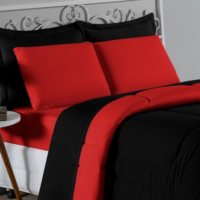 Kit Edredom Dupla Face + Jogo De Lençol Casal Nobre 7 Peças Malha 100% Algodão - Preto / VermelhoVista sua cama com elegância total e conforto absoluto com o Kit Cama Completa Casal Nobre 7 Peças. A solução definitiva para quem busca um enxoval completo, coordenado e com a maciez irresistível da malha de algodão.Por que este Kit é uma ótima escolha?- Jogo Completo 7 Peças: Inclui edredom, porta travesseiros decorativos e o jogo de cama completo (com lençol de cima e de baixo), oferecendo a experiência completa de conforto.- Malha Premium: Confeccionado em 100% Algodão Fio 30/1 Penteado, garantindo um toque suave, natural e livre de bolinhas.- Versatilidade na Decoração: O edredom dupla face permite variar o visual, enquanto o lençol de cima com vira adiciona charme à cama posta.- Aconchego e Praticidade: Une o aquecimento do edredom à facilidade do lençol com elástico, perfeito para o dia a dia.Produto composto por (Total 07 Peças):Do Kit Edredom (03 Peças):01 Edredom Casal Dupla Face: 2,00m x 2,20m02 Porta Travesseiros Matelados: 50cm x 70cmDo Jogo de Lençol (04 Peças):01 Lençol de Cima (Virol): 2,40m x 2,20m01 Lençol de Baixo com Elástico: 1,38m x 1,98m x 30cm02 Fronhas: 70cm x 50cmComposição:Tecido (Todas as peças): Malha 100% Algodão - Fio 30/1 PenteadoEnchimento (Edredom e Porta Travesseiros): 100% Poliéster (Edredom com fibra siliconada)Forro (Apenas Porta Travesseiros): 100% Polipropileno