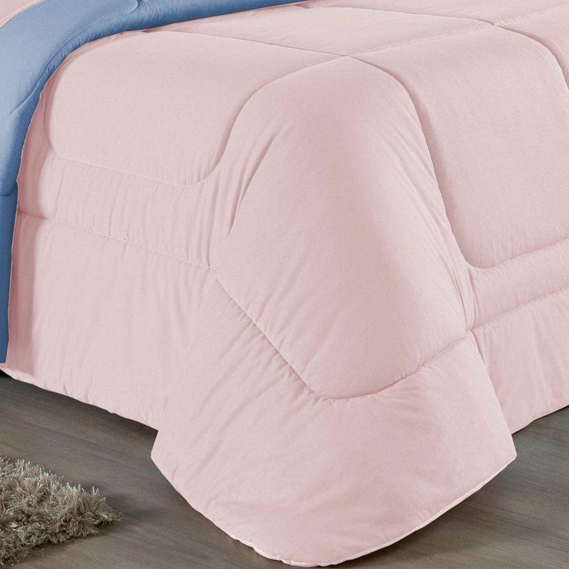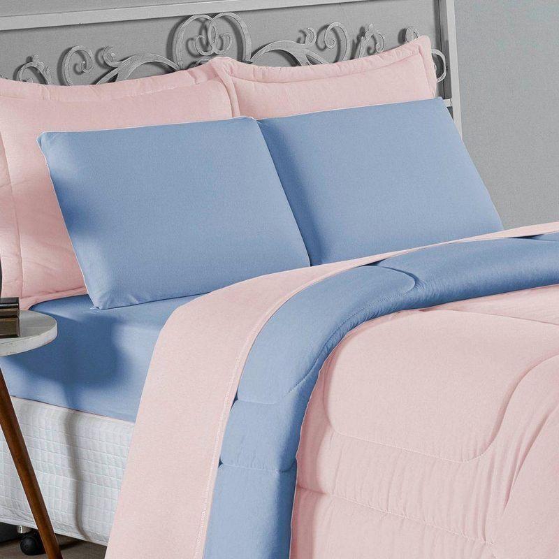 Kit Edredom Dupla Face + Jogo De Lençol Casal Nobre 7 Peças Malha 100% Algodão - Rosa / Azul-bebêVista sua cama com elegância total e conforto absoluto com o Kit Cama Completa Casal Nobre 7 Peças. A solução definitiva para quem busca um enxoval completo, coordenado e com a maciez irresistível da malha de algodão.Por que este Kit é uma ótima escolha?- Jogo Completo 7 Peças: Inclui edredom, porta travesseiros decorativos e o jogo de cama completo (com lençol de cima e de baixo), oferecendo a experiência completa de conforto.- Malha Premium: Confeccionado em 100% Algodão Fio 30/1 Penteado, garantindo um toque suave, natural e livre de bolinhas.- Versatilidade na Decoração: O edredom dupla face permite variar o visual, enquanto o lençol de cima com vira adiciona charme à cama posta.- Aconchego e Praticidade: Une o aquecimento do edredom à facilidade do lençol com elástico, perfeito para o dia a dia.Produto composto por (Total 07 Peças):Do Kit Edredom (03 Peças):01 Edredom Casal Dupla Face: 2,00m x 2,20m02 Porta Travesseiros Matelados: 50cm x 70cmDo Jogo de Lençol (04 Peças):01 Lençol de Cima (Virol): 2,40m x 2,20m01 Lençol de Baixo com Elástico: 1,38m x 1,98m x 30cm02 Fronhas: 70cm x 50cmComposição:Tecido (Todas as peças): Malha 100% Algodão - Fio 30/1 PenteadoEnchimento (Edredom e Porta Travesseiros): 100% Poliéster (Edredom com fibra siliconada)Forro (Apenas Porta Travesseiros): 100% Polipropileno