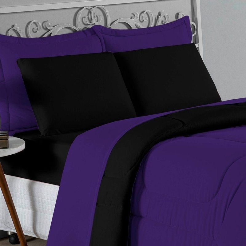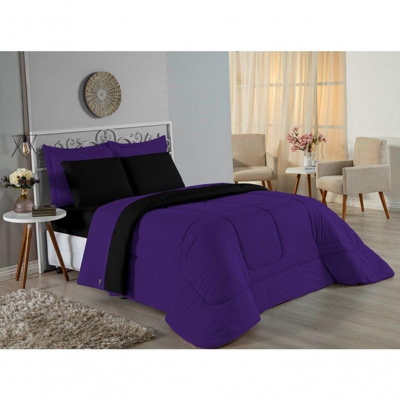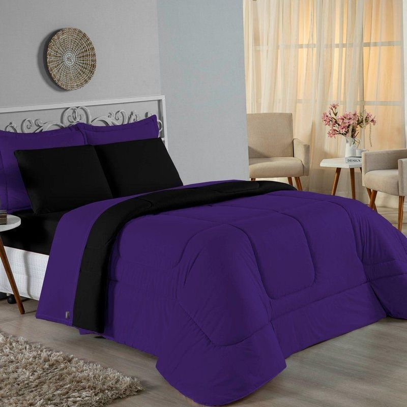 Kit Edredom Dupla Face + Jogo De Lençol Casal Nobre 7 Peças Malha 100% Algodão - Roxo / PretoVista sua cama com elegância total e conforto absoluto com o Kit Cama Completa Casal Nobre 7 Peças. A solução definitiva para quem busca um enxoval completo, coordenado e com a maciez irresistível da malha de algodão.Por que este Kit é uma ótima escolha?- Jogo Completo 7 Peças: Inclui edredom, porta travesseiros decorativos e o jogo de cama completo (com lençol de cima e de baixo), oferecendo a experiência completa de conforto.- Malha Premium: Confeccionado em 100% Algodão Fio 30/1 Penteado, garantindo um toque suave, natural e livre de bolinhas.- Versatilidade na Decoração: O edredom dupla face permite variar o visual, enquanto o lençol de cima com vira adiciona charme à cama posta.- Aconchego e Praticidade: Une o aquecimento do edredom à facilidade do lençol com elástico, perfeito para o dia a dia.Produto composto por (Total 07 Peças):Do Kit Edredom (03 Peças):01 Edredom Casal Dupla Face: 2,00m x 2,20m02 Porta Travesseiros Matelados: 50cm x 70cmDo Jogo de Lençol (04 Peças):01 Lençol de Cima (Virol): 2,40m x 2,20m01 Lençol de Baixo com Elástico: 1,38m x 1,98m x 30cm02 Fronhas: 70cm x 50cmComposição:Tecido (Todas as peças): Malha 100% Algodão - Fio 30/1 PenteadoEnchimento (Edredom e Porta Travesseiros): 100% Poliéster (Edredom com fibra siliconada)Forro (Apenas Porta Travesseiros): 100% Polipropileno