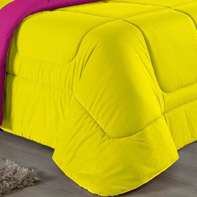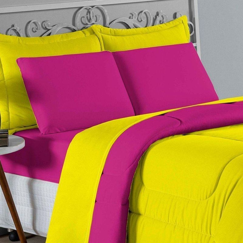 Kit Edredom Dupla Face + Jogo De Lençol Casal Viúva Nobre 6 Peças Malha 100% Algodão - Amarelo / PinkRenove o quarto das crianças ou de visitas com o Kit Cama Completa Casal Viúva Nobre 6 Peças. Uma solução prática e extremamente confortável que une o aquecimento do edredom, a elegância do porta travesseiro matelado e a suavidade do jogo de lençol em malha 100% algodão. Essa medida especial foi feita para as camas cama casal viúva ou solteiro viúva.Por que este Kit é uma ótima escolha?- Conforto da Malha Penteada: Todas as peças em contato com a pele são feitas em Malha 100% Algodão Fio 30/1 Penteado, garantindo toque macio, frescor e alta durabilidade sem formar bolinhas.- Cama Posta Coordenada: O kit já vem combinando! O edredom dupla face e o porta travesseiro decoram, enquanto o lençol e a fronha vestem o colchão com perfeição.- Praticidade do Elástico: O lençol de baixo possui elástico em toda a volta, facilitando a arrumação diária e garantindo que ele não escape do colchão.- Aconchego Térmico: O edredom com enchimento siliconado oferece o peso e o calor ideais para uma noite de sono tranquila.Produto composto por (Total 06 Peças):Do Kit Edredom (03 Peças):01 Edredom Casal Viúva Dupla Face: 2,00m x 2,20m02 Porta Travesseiro Matelado: 50cm x 70cmDo Jogo de Lençol (03 Peças):01 Lençol Casal Viúva com Elástico 1,28m x 1,98m x 30cm02 Fronha: 70cm x 50cmAtenção: Este kit é composto pelo jogo de cama essencial (lençol com elástico e fronha) e não inclui o lençol de cima (sobre lençol).Composição:Tecido (Todas as peças): Malha 100% Algodão - Fio 30/1 PenteadoEnchimento (Edredom e Porta Travesseiro): 100% Poliéster (Edredom com fibra siliconada)Forro (Apenas Porta Travesseiro): 100% Polipropileno