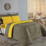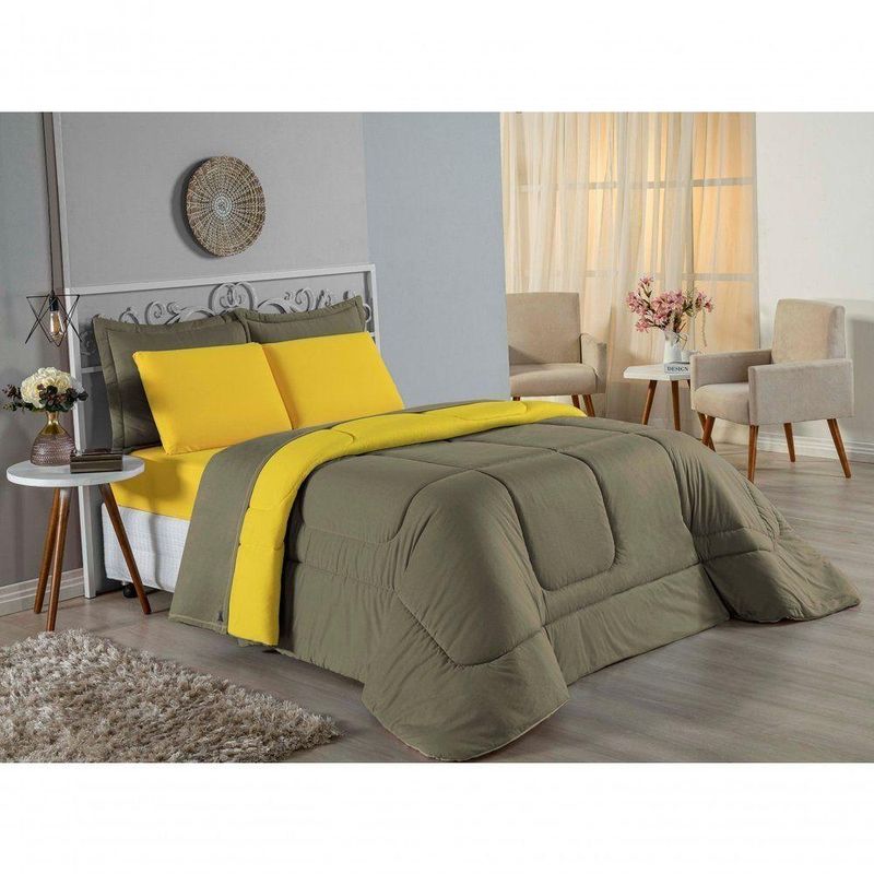 Kit Edredom Dupla Face + Jogo De Lençol Casal Viúva Nobre 6 Peças Malha 100% Algodão - Avelã / AmareloRenove o quarto das crianças ou de visitas com o Kit Cama Completa Casal Viúva Nobre 6 Peças. Uma solução prática e extremamente confortável que une o aquecimento do edredom, a elegância do porta travesseiro matelado e a suavidade do jogo de lençol em malha 100% algodão. Essa medida especial foi feita para as camas cama casal viúva ou solteiro viúva.Por que este Kit é uma ótima escolha?- Conforto da Malha Penteada: Todas as peças em contato com a pele são feitas em Malha 100% Algodão Fio 30/1 Penteado, garantindo toque macio, frescor e alta durabilidade sem formar bolinhas.- Cama Posta Coordenada: O kit já vem combinando! O edredom dupla face e o porta travesseiro decoram, enquanto o lençol e a fronha vestem o colchão com perfeição.- Praticidade do Elástico: O lençol de baixo possui elástico em toda a volta, facilitando a arrumação diária e garantindo que ele não escape do colchão.- Aconchego Térmico: O edredom com enchimento siliconado oferece o peso e o calor ideais para uma noite de sono tranquila.Produto composto por (Total 06 Peças):Do Kit Edredom (03 Peças):01 Edredom Casal Viúva Dupla Face: 2,00m x 2,20m02 Porta Travesseiro Matelado: 50cm x 70cmDo Jogo de Lençol (03 Peças):01 Lençol Casal Viúva com Elástico 1,28m x 1,98m x 30cm02 Fronha: 70cm x 50cmAtenção: Este kit é composto pelo jogo de cama essencial (lençol com elástico e fronha) e não inclui o lençol de cima (sobre lençol).Composição:Tecido (Todas as peças): Malha 100% Algodão - Fio 30/1 PenteadoEnchimento (Edredom e Porta Travesseiro): 100% Poliéster (Edredom com fibra siliconada)Forro (Apenas Porta Travesseiro): 100% Polipropileno