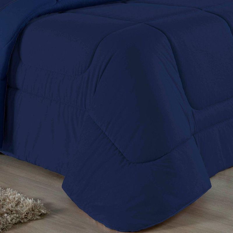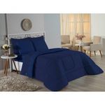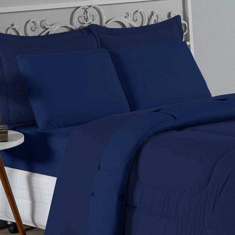 Kit Edredom Dupla Face + Jogo De Lençol Casal Viúva Nobre 6 Peças Malha 100% Algodão - Azul-marinhoRenove o quarto das crianças ou de visitas com o Kit Cama Completa Casal Viúva Nobre 6 Peças. Uma solução prática e extremamente confortável que une o aquecimento do edredom, a elegância do porta travesseiro matelado e a suavidade do jogo de lençol em malha 100% algodão. Essa medida especial foi feita para as camas cama casal viúva ou solteiro viúva.Por que este Kit é uma ótima escolha?- Conforto da Malha Penteada: Todas as peças em contato com a pele são feitas em Malha 100% Algodão Fio 30/1 Penteado, garantindo toque macio, frescor e alta durabilidade sem formar bolinhas.- Cama Posta Coordenada: O kit já vem combinando! O edredom dupla face e o porta travesseiro decoram, enquanto o lençol e a fronha vestem o colchão com perfeição.- Praticidade do Elástico: O lençol de baixo possui elástico em toda a volta, facilitando a arrumação diária e garantindo que ele não escape do colchão.- Aconchego Térmico: O edredom com enchimento siliconado oferece o peso e o calor ideais para uma noite de sono tranquila.Produto composto por (Total 06 Peças):Do Kit Edredom (03 Peças):01 Edredom Casal Viúva Dupla Face: 2,00m x 2,20m02 Porta Travesseiro Matelado: 50cm x 70cmDo Jogo de Lençol (03 Peças):01 Lençol Casal Viúva com Elástico 1,28m x 1,98m x 30cm02 Fronha: 70cm x 50cmAtenção: Este kit é composto pelo jogo de cama essencial (lençol com elástico e fronha) e não inclui o lençol de cima (sobre lençol).Composição:Tecido (Todas as peças): Malha 100% Algodão - Fio 30/1 PenteadoEnchimento (Edredom e Porta Travesseiro): 100% Poliéster (Edredom com fibra siliconada)Forro (Apenas Porta Travesseiro): 100% Polipropileno